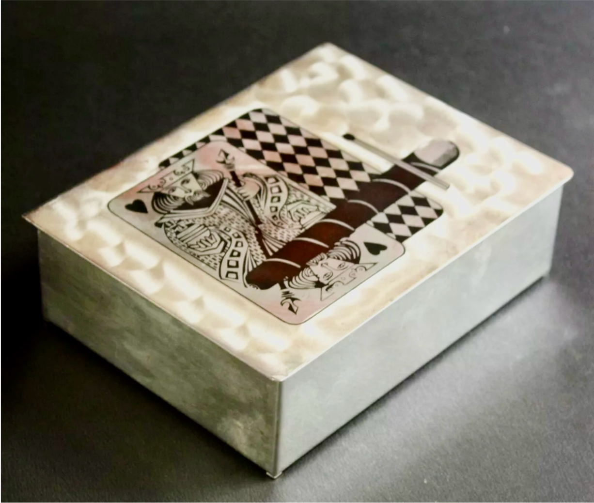 Boîte de bureau à cigarillos En métal plaqué argent et de forme rectangulaire, rehaussé au recto d’une œuvre monochrome couleur bronze et rosé, représentant une carte à jouer du Roi de Coeur et son verso jacquard en losange, agrémenté d’un cigare et d’une allumette. Le tout sur fond dépoli façon nacrée.Capot à zéro débordant pour soulèvement. 4 pattes angulaires.