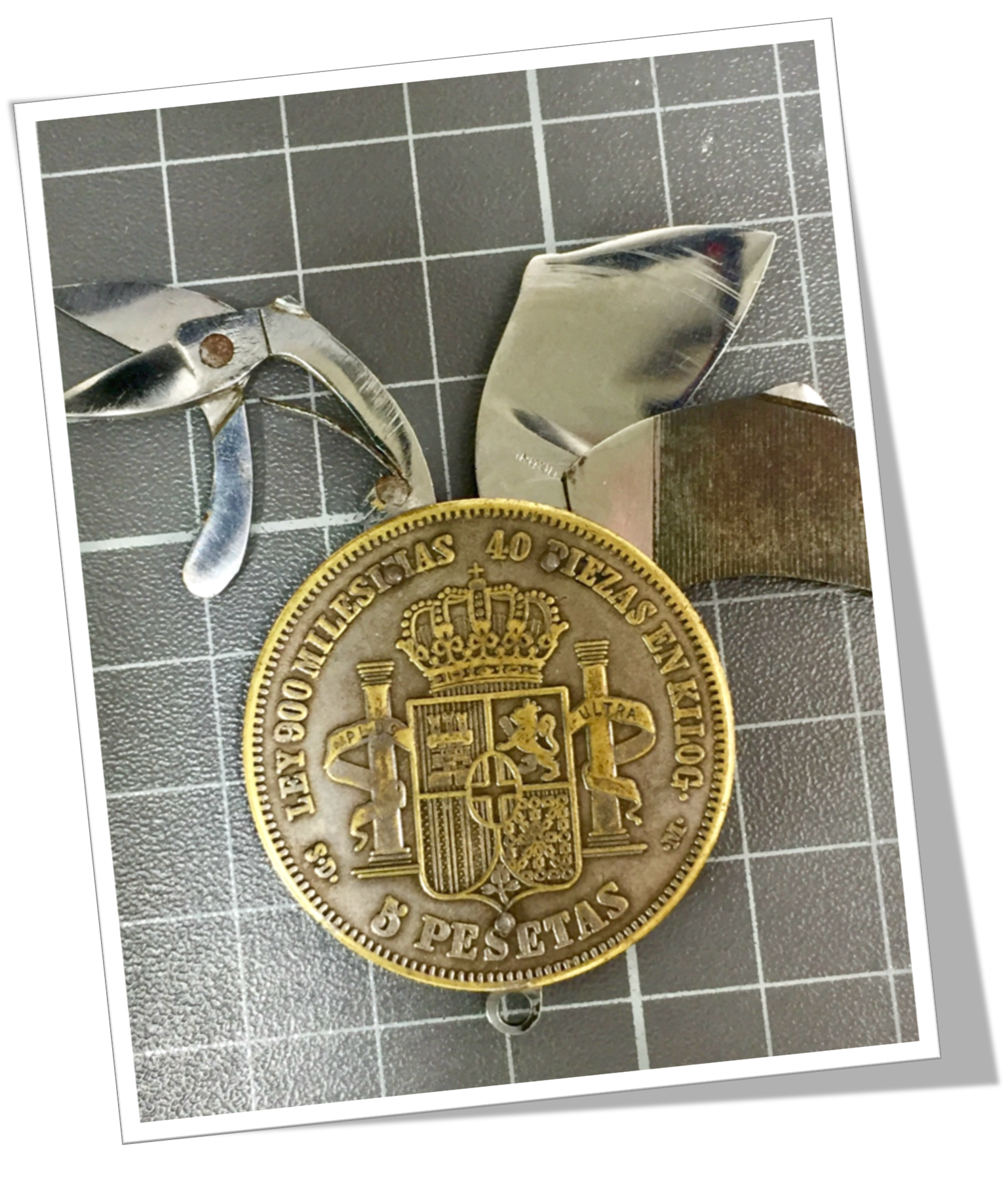 Coin-Knife (onglier) Pièce factice en laiton, tranchée et rivetée. Amadeo I, Espagne 1871.3pcs: Lame, lime et ciseaux .