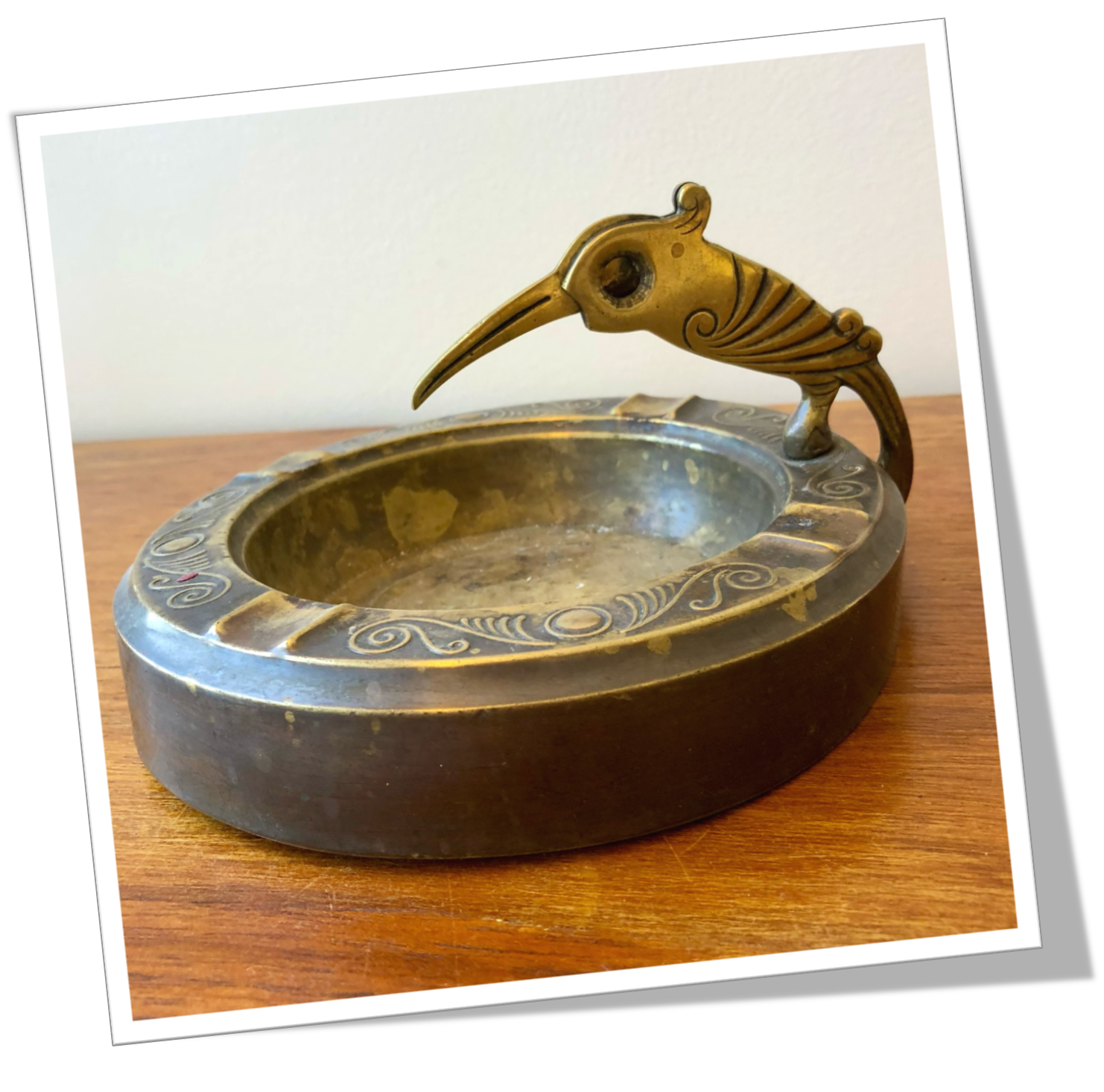 En laiton. Oiseau exotique perché sur un cendrier circulaire ciselé.