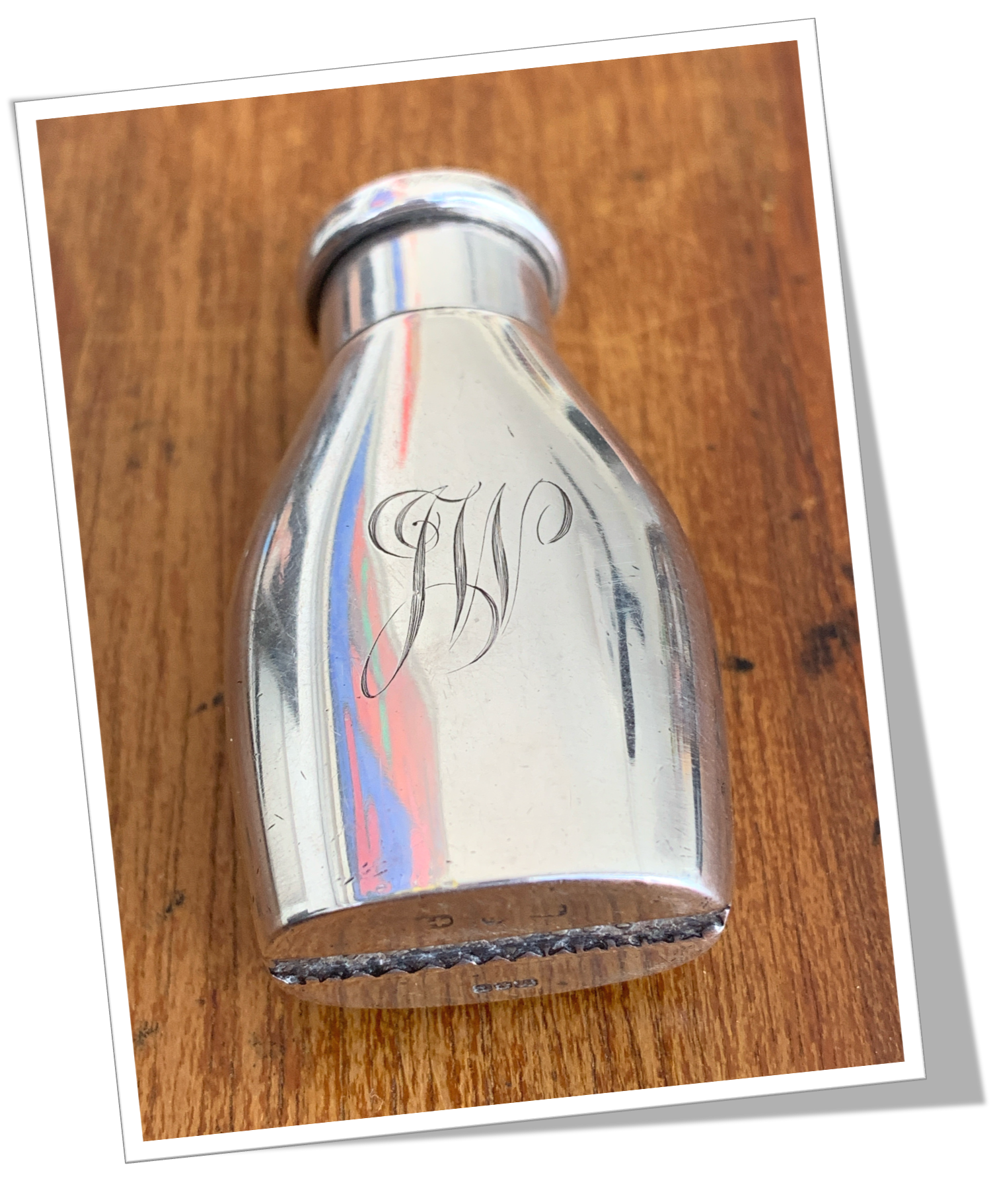 En argent 925 et en forme de flasque. Lisse poli miroir, agrémenté au recto du monogramme gravé « JW ». De style Novelty Victorien.