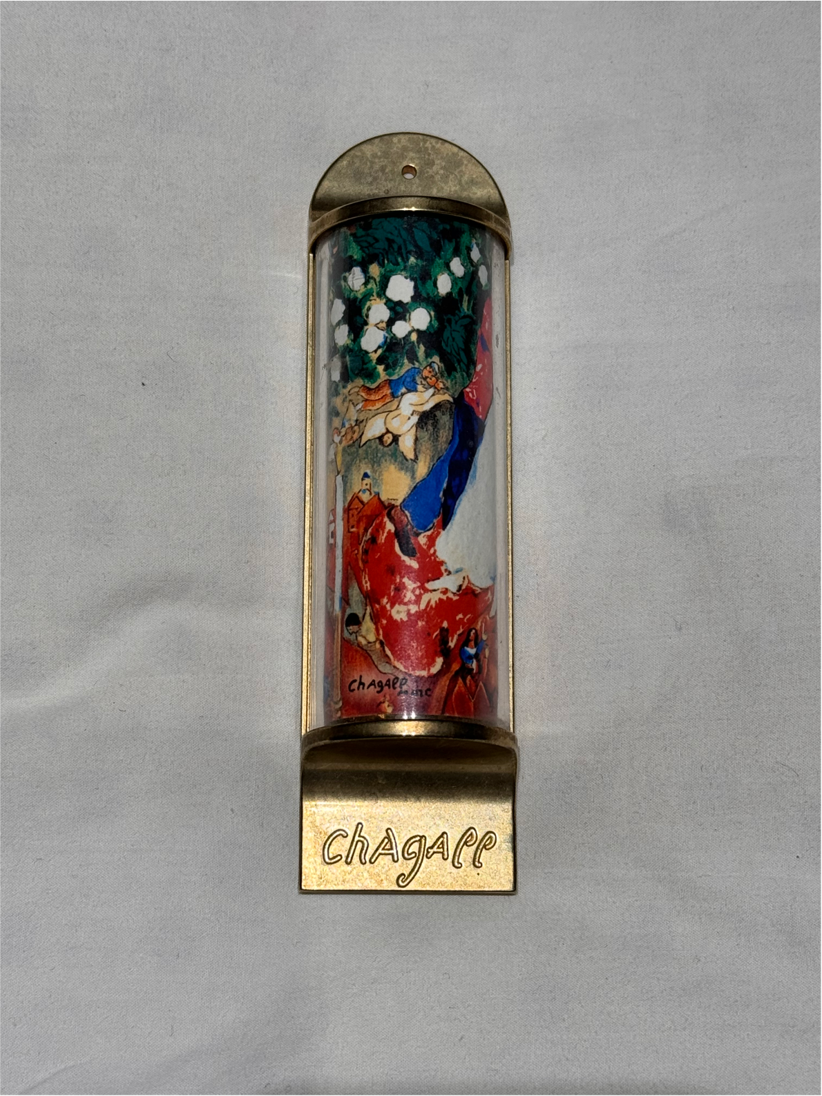 Mézouzah en métal doré, gravé de la signature Chagall et, à insert en plexiglass, comprenant une reproduction d'une œuvre de Marc Chagall. (amoureux)
