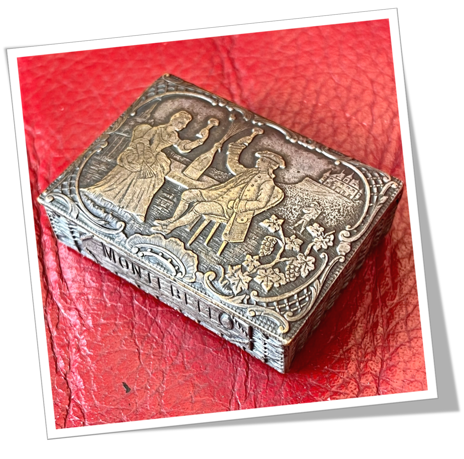Pyrogène Vesta Case En laiton, moulé et texturé en forme de caisse de champagne en osier. Tressé façon panier en osier. Capot rehaussé d’une scène de taverne ciselée, représentant un homme et une femme attablés en extérieur, auprès de pieds de vignes, buvant ensemble. Chateau domaine en arrière plan.Capot à zéro. Grattoir plat latéral.
