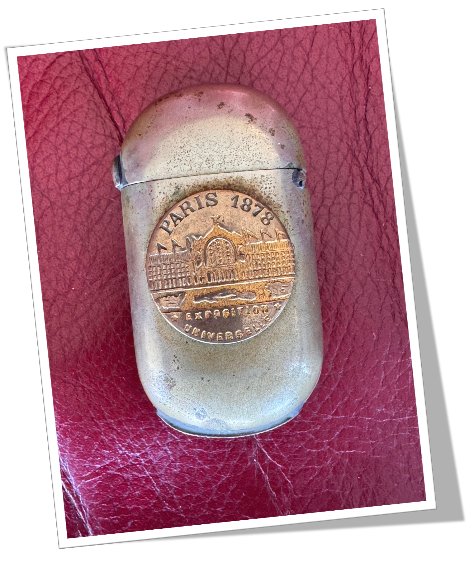 Pyrogène Vesta Case En métal argenté et de forme ovoïde. Rehaussé au recto d’un médaillon souvenir de l’exposition universelle de Paris en 1878, agrémenté de la façade d’un pavillon.Clapet 1/5 4/5 et grattoir plat à la base.