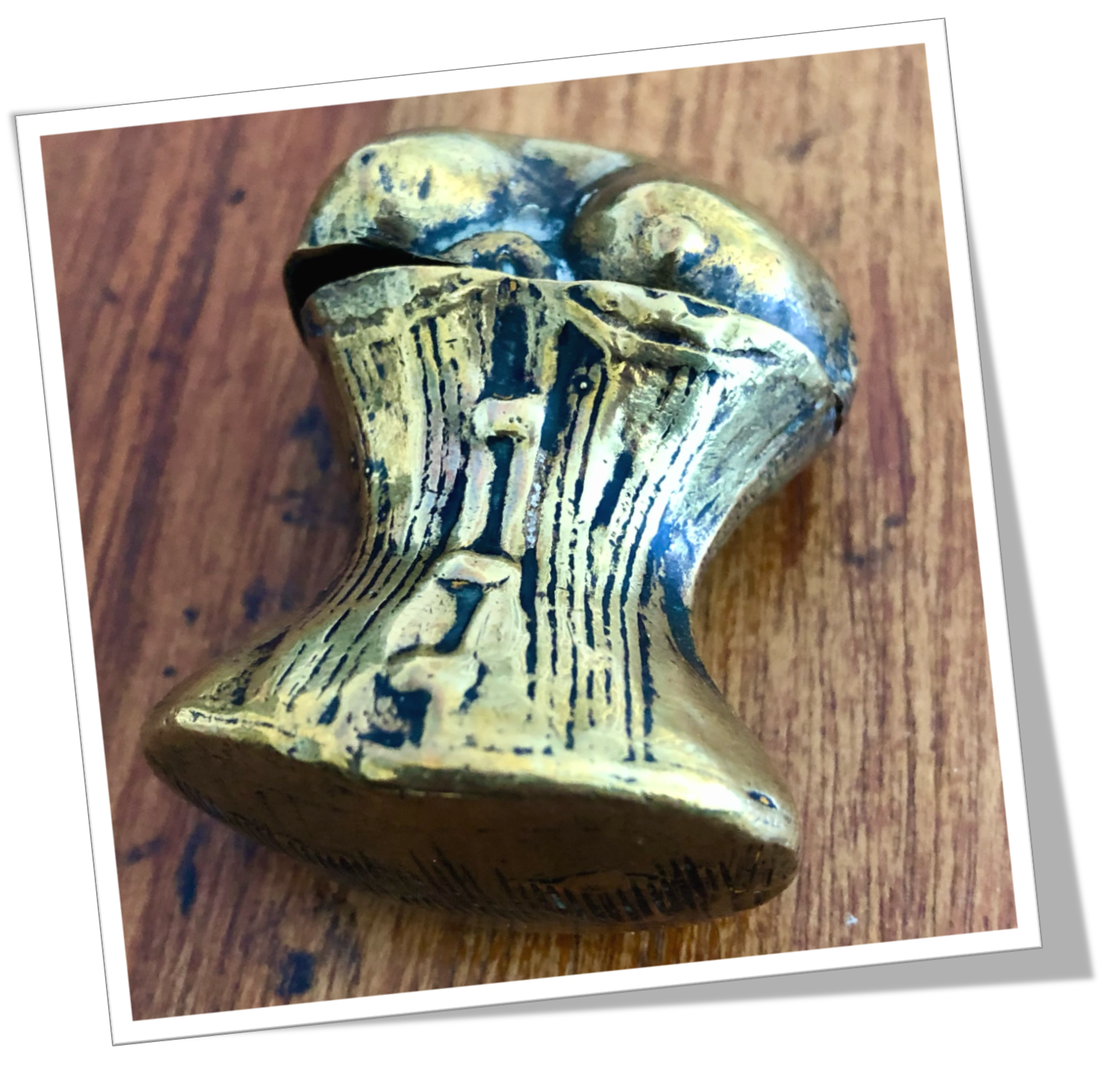 En laiton, moulé et texturé, en forme de bustier, corset érotique, laissant les seins nus.
