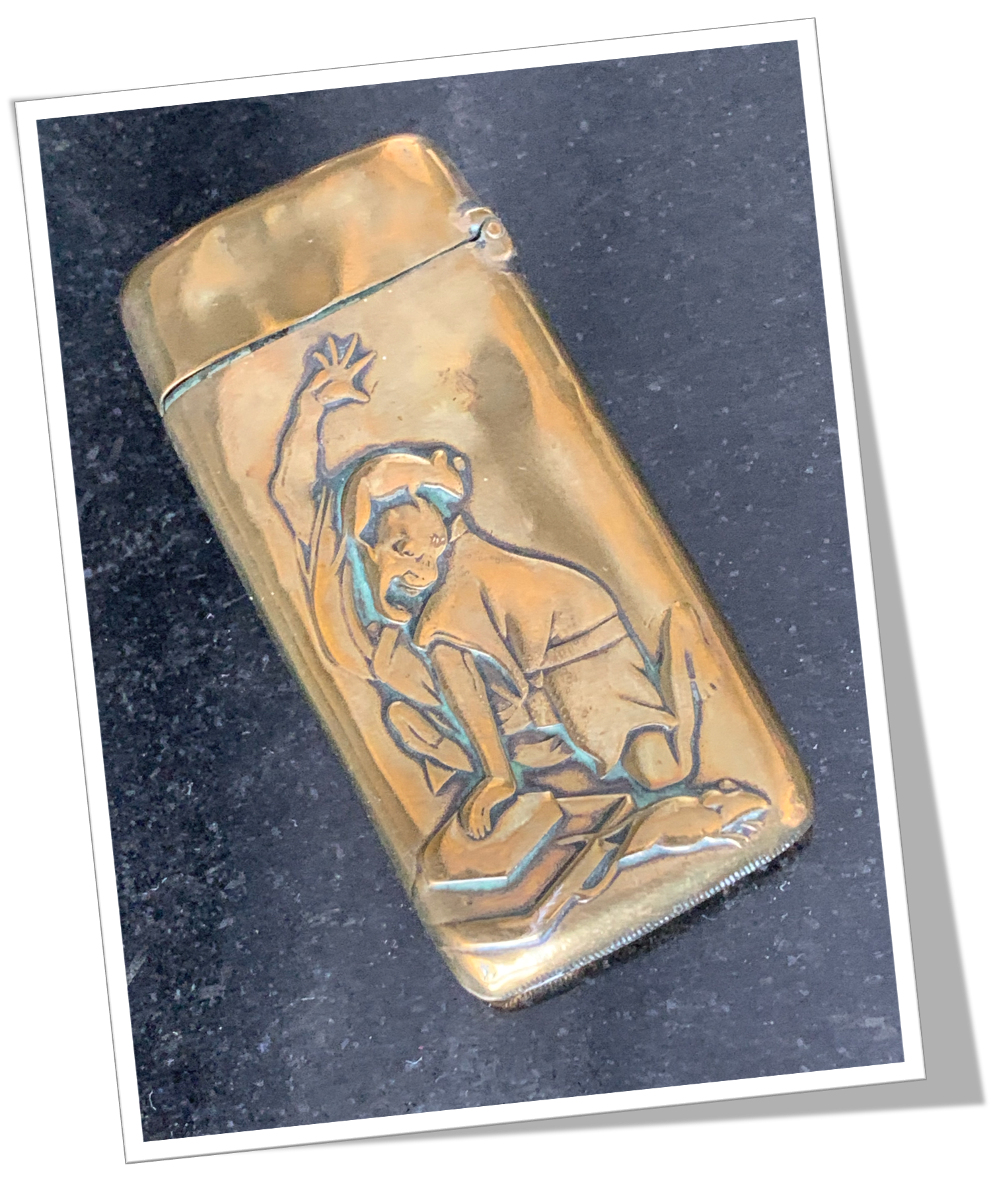 Pyrogène Vesta Case En laiton et de forme rectangulaire. Rehaussée d’un relief en technique « repoussé », de style Japonisant, représentant un homme accroupi, tentant d’attraper un rat en fuite.Clapet 1/5 4/5 et grattoir plat à la base.