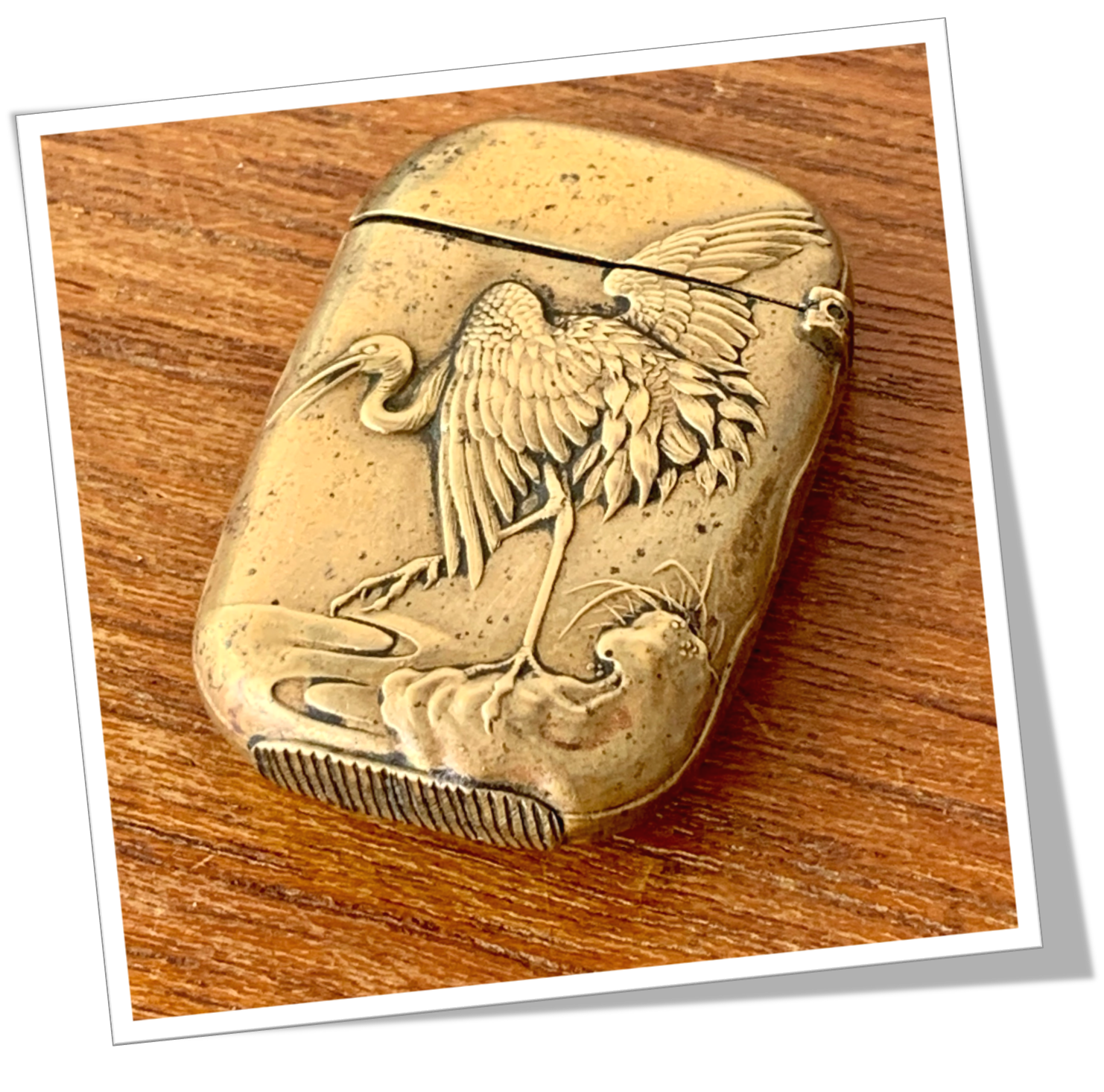 Pyrogène Vesta Case En laiton et de forme ovoïde, rehaussé d’un relief en technique « repoussé » et de style Japonisant, représentant un oiseau grue au bord du lac.Clapet 1/5 4/5 et grattoir plat à la base.