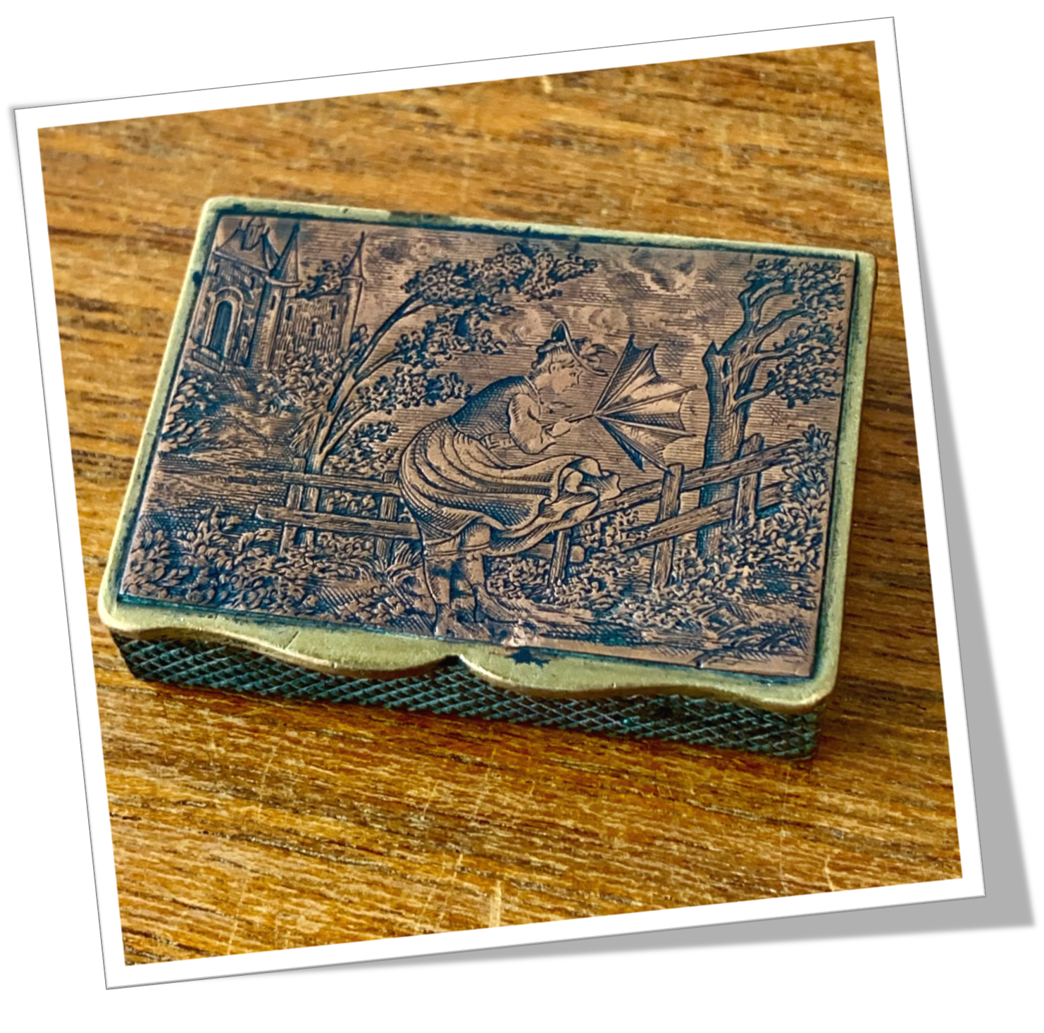 Pyrogène Vesta Case En laiton et de forme rectangulaire. Agrémenté sur le capot d’une scène gravée de style Belle Époque, représentant au premier plan, une dame dans les intempérie, tenant un parapluie renversé et sa robe qui volt au vent et, en second plan, une grande maison dans la prairie et des arbres cabrés par le vent qui souffle. Capot ressort à zéro. Bordure avant ondulée. Grattoir frontal plat.
