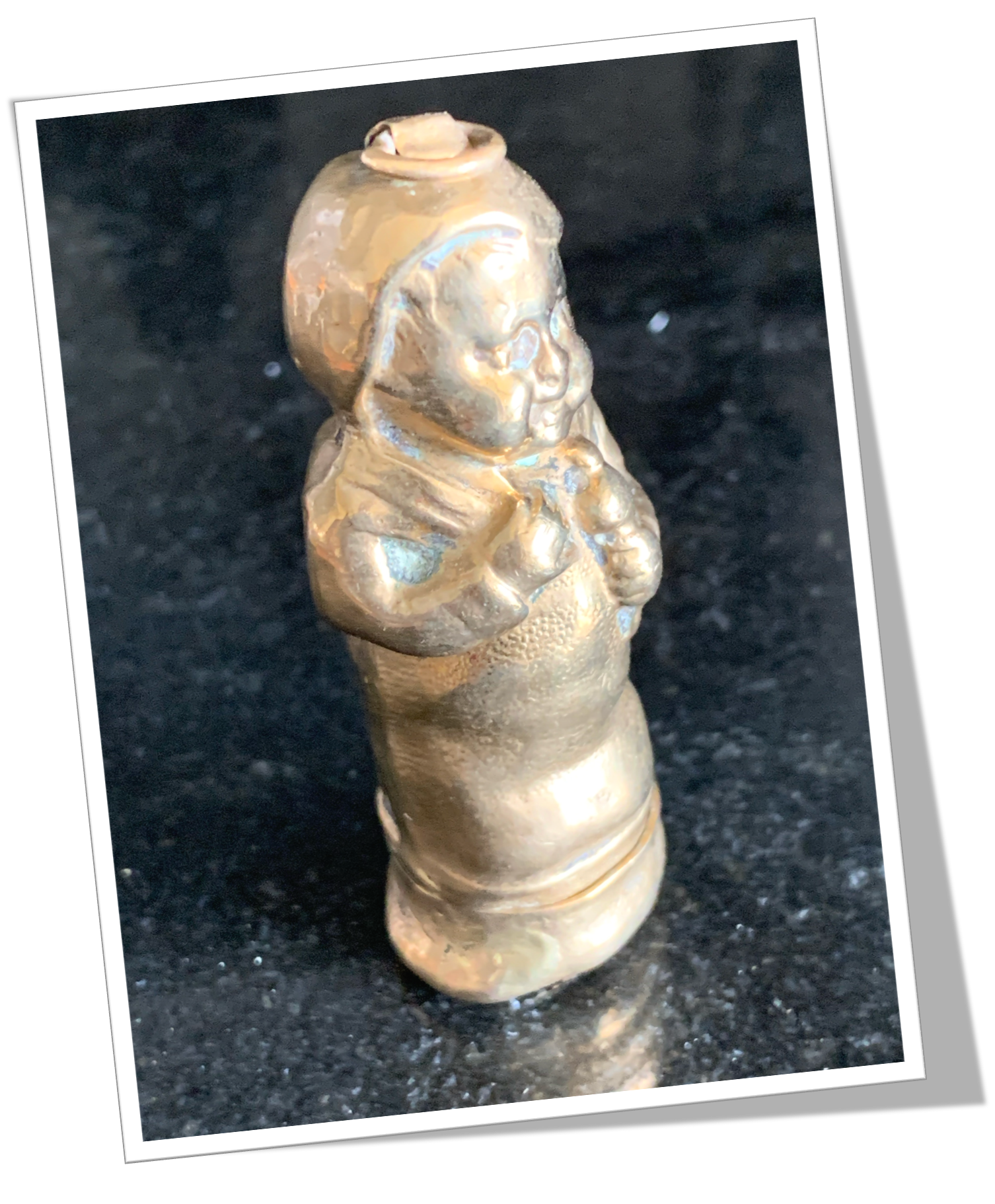 Pyrogène Vesta Case En laiton, moulé et texturé en forme de bébé langé.Clapet 1/5 4/5. Grattoir plat sur le clapet.