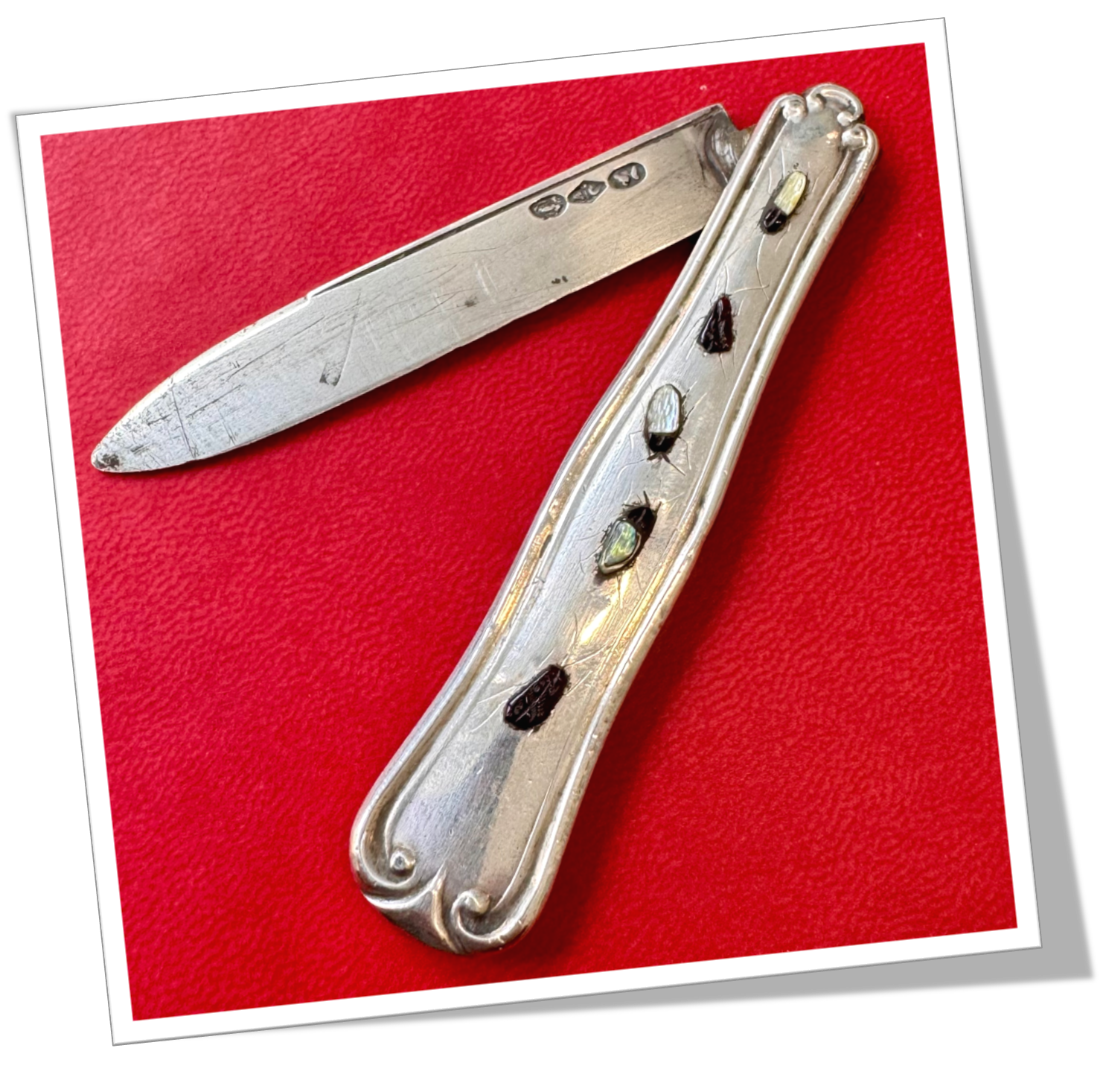 Couteau canif En argent 925. Manche à côtes ondulées, rehaussées d’un encadrement ornemental et, agrémentées au recto d’insectes appliqués de style Shibayama.1pcs: Grande lame à fruit (en argent).