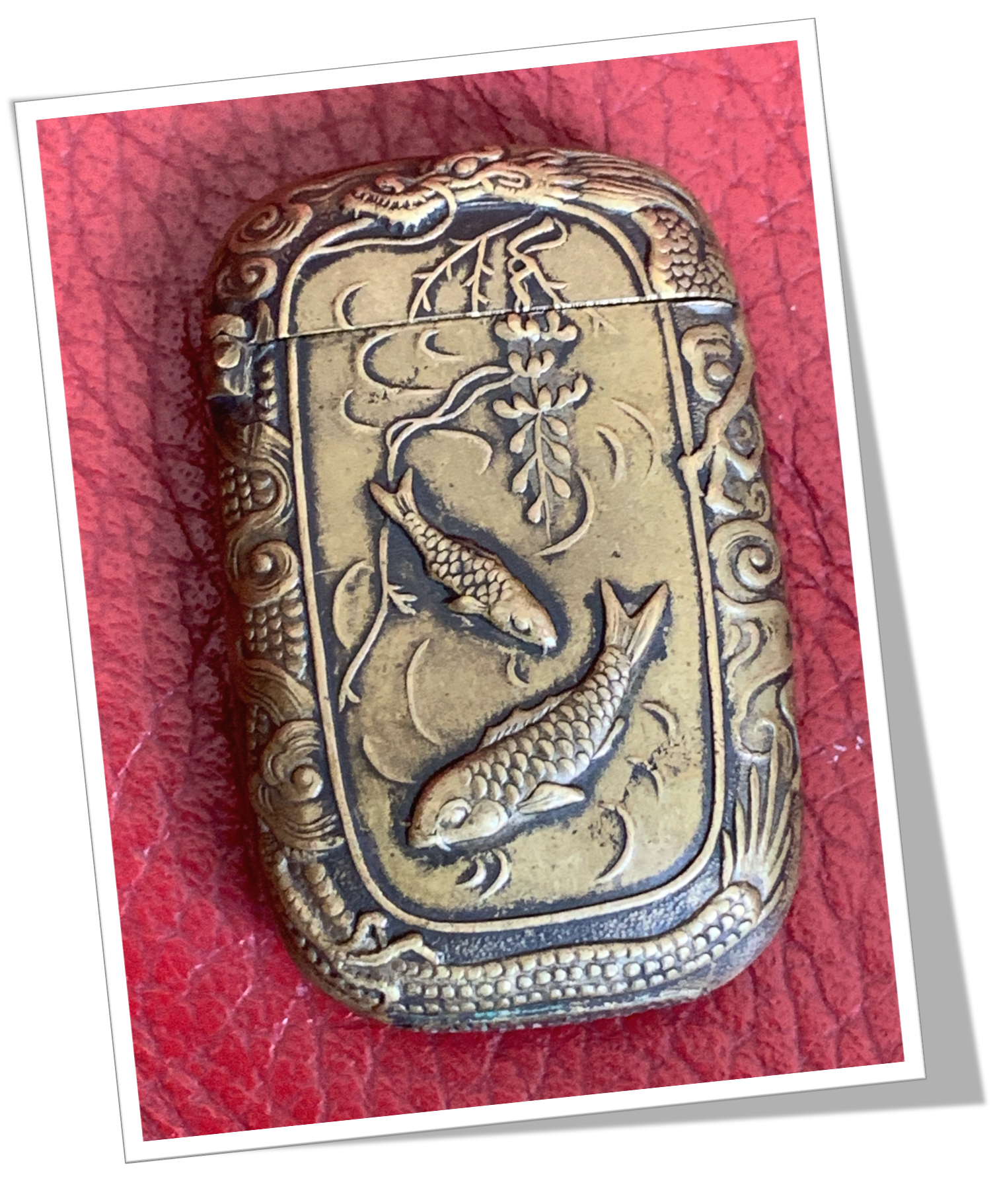 Pyrogène Vesta Case En laiton et de forme rectangulaire. Rehaussée d’un relief en technique « repoussé » de style japonisant, représentant des poissons carpes en mouvement.Clapet 1/5 4/5 et grattoir plat à la base.