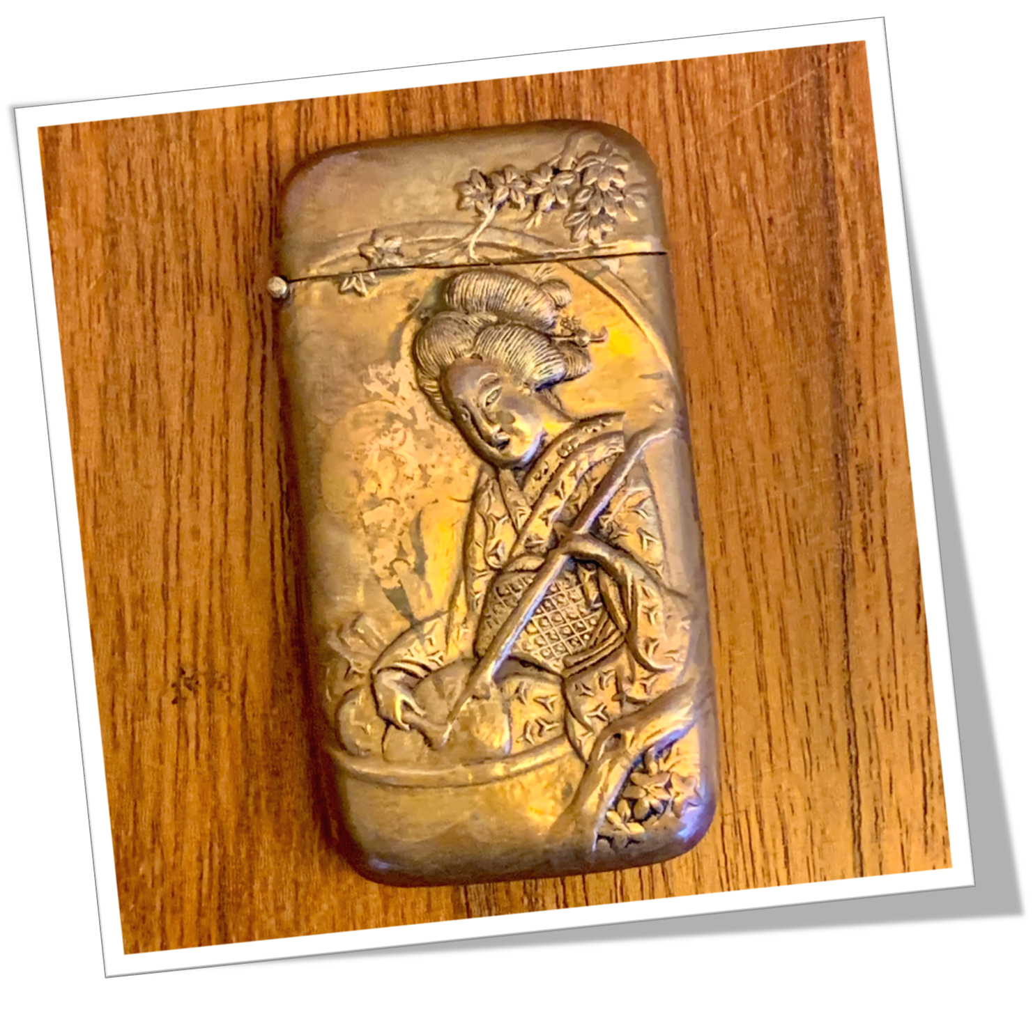 Pyrogène Vesta Case En laiton et de forme rectangulaire, rehaussé d’un relief en technique « repoussé » et de style japonisant, représentant une femme jouant de l’instrument de l’Erhu.Clapet 1/5 4/5 et grattoir plat à la base.