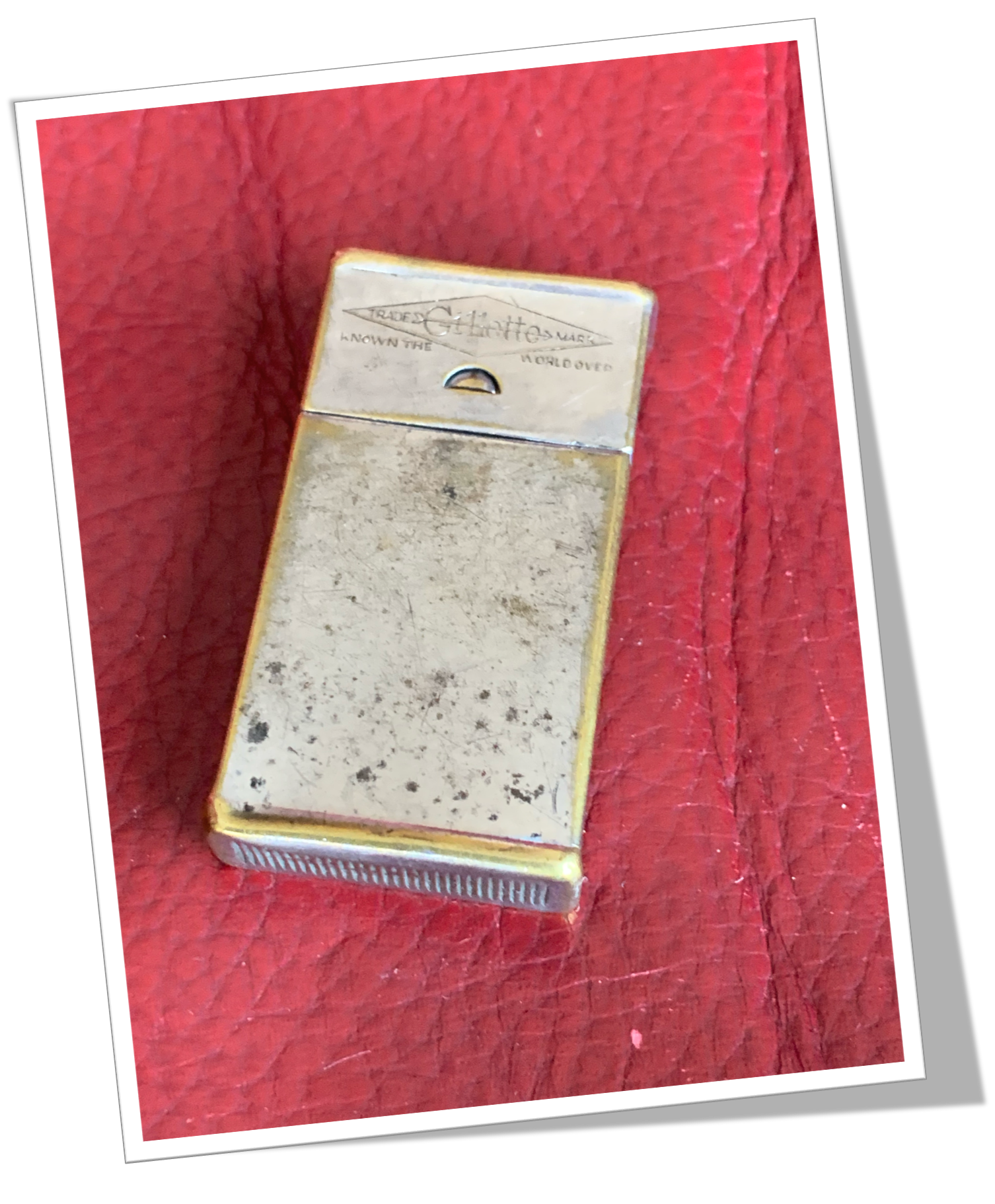 En métal laiton argenté et forme rectangulaire à angles droits. Agrémenté au recto de l’inscription publicitaire « Gillette Trade Mark (dans un losange.