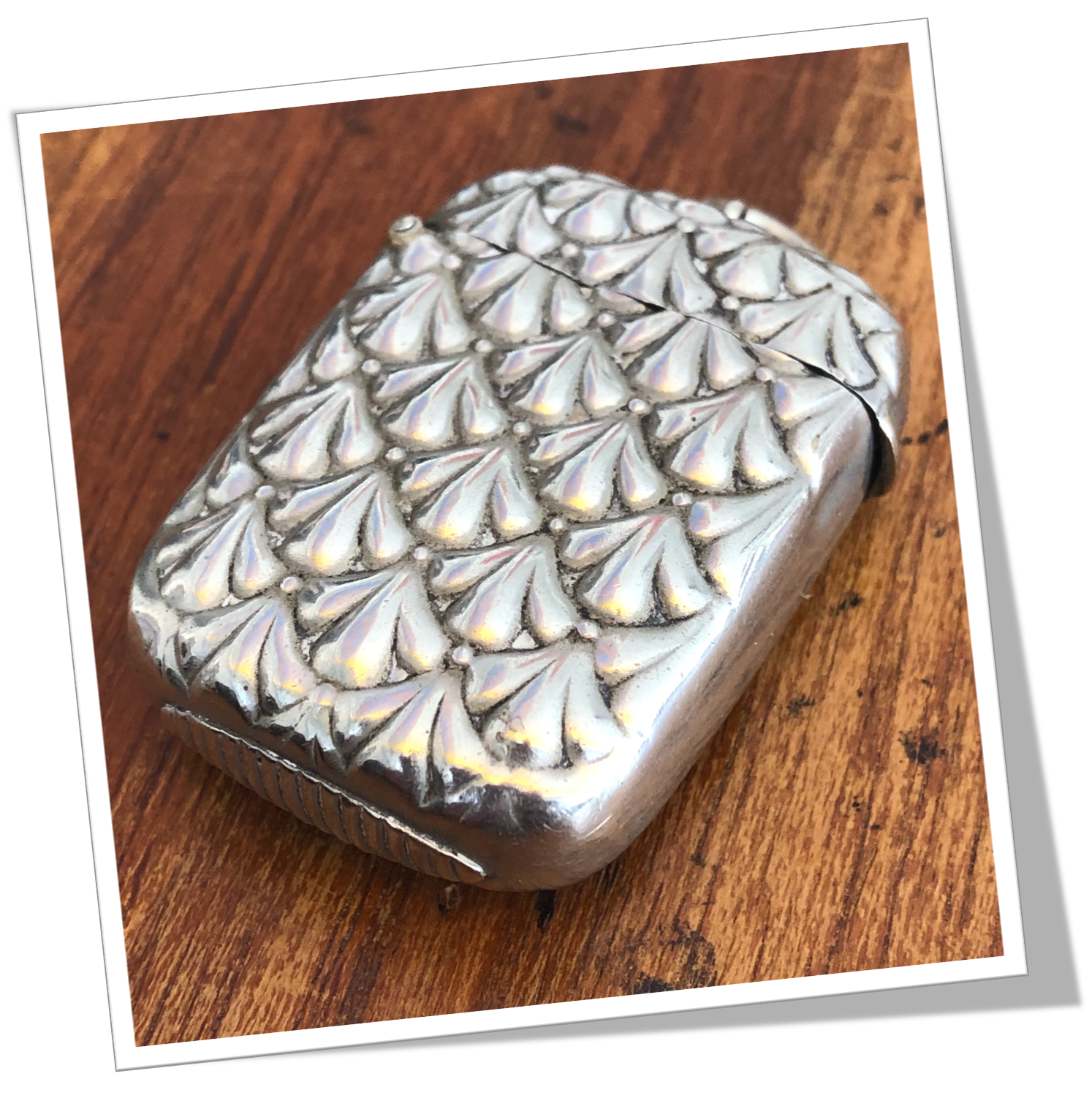 Pyrogène Vesta Case En métal argenté et de forme rectangulaire. Rehaussé d’un relief cinétique en technique repoussé de « coquillages gouttes ».Clapet 1/5 4/5 et grattoir plat à la base.
