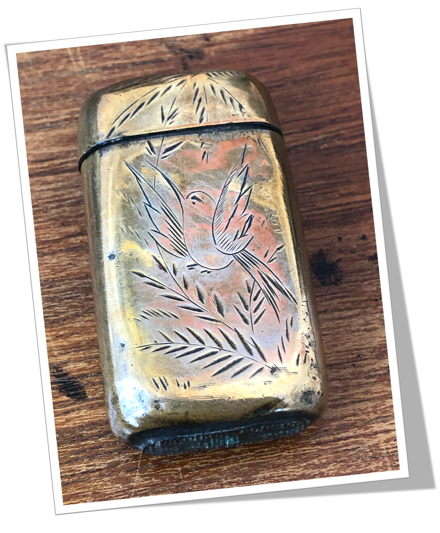 Pyrogène Vesta Case En laiton et de forme rectangulaire, rehaussé au recto d’une gravure de style japonisant, représentant une hirondelle volant et feuillage.Clapet 1/5 4/5 et grattoir plat à la base.