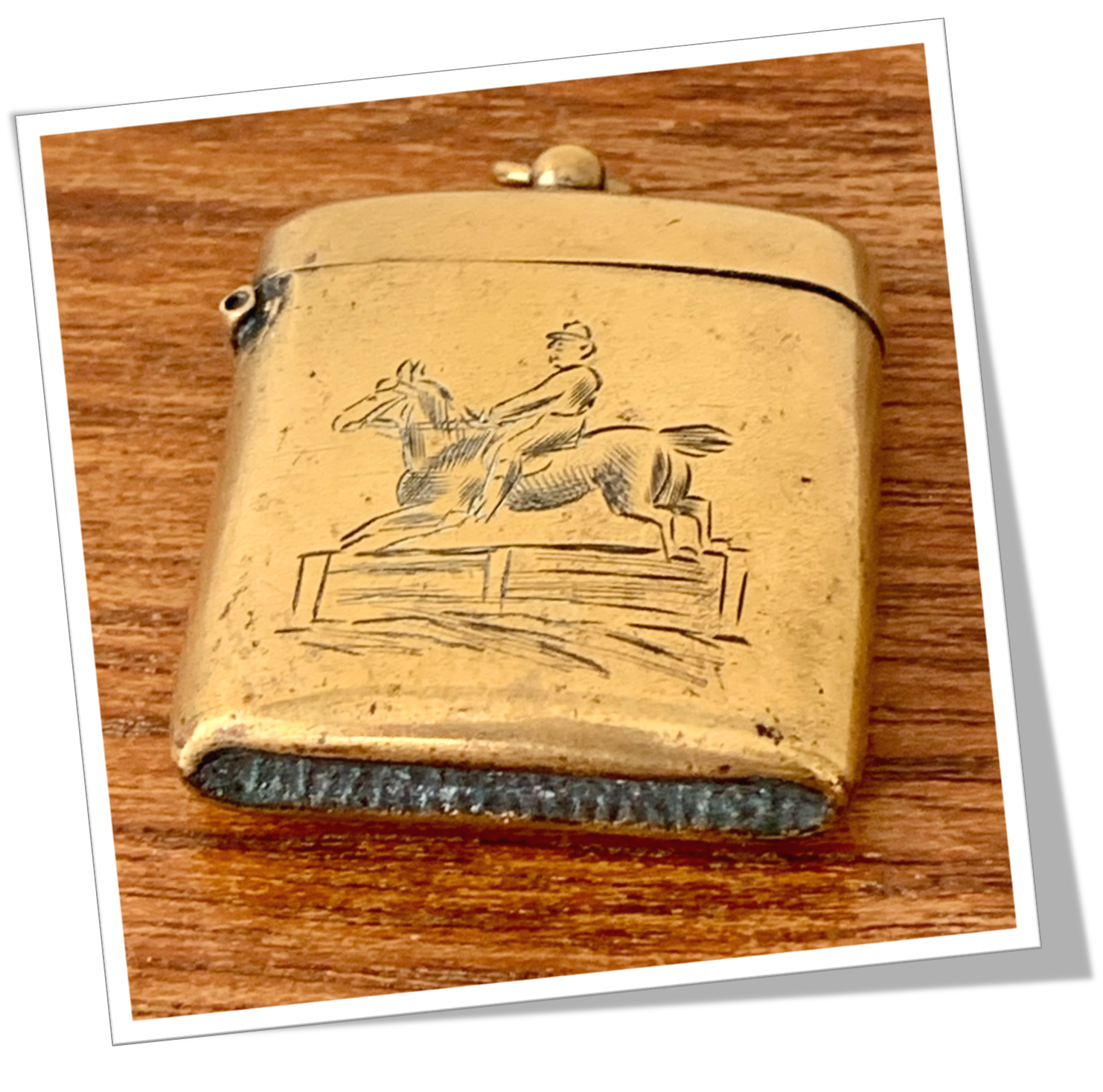 Pyrogène Vesta Case En laiton et de forme carré. Rehaussée au recto d’une gravure, représentant un jockey au galop, sautant un obstacle.Clapet 1/5 4/5 et grattoir concave à la base. Bélière haute.