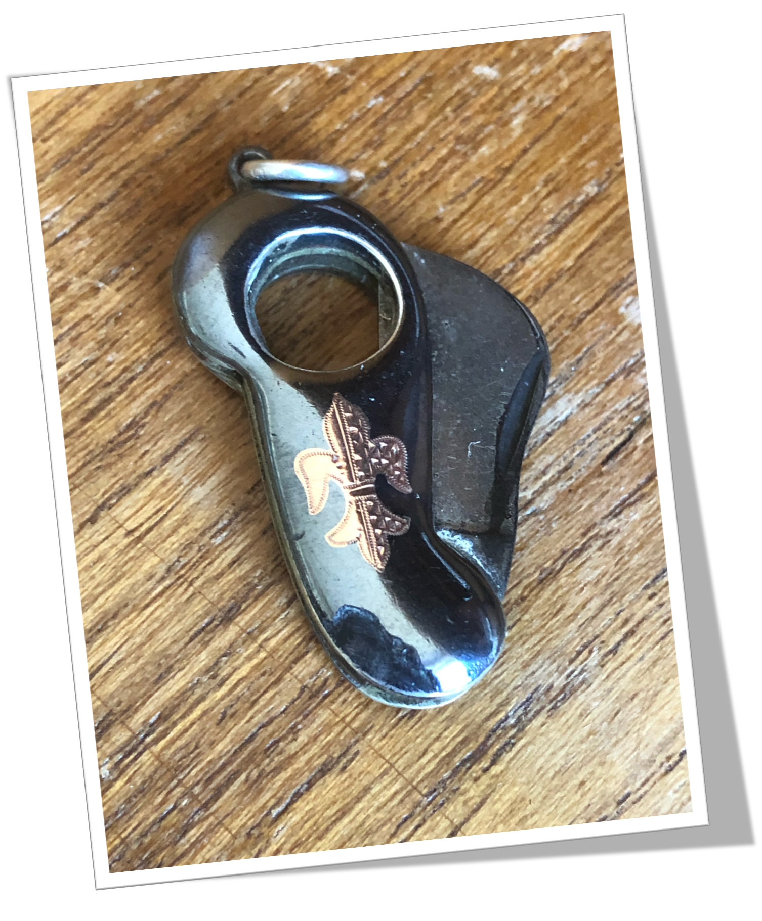 Côtes en forme de corne d’abondance, bombées et appliquées en argent 925 niellé. Fleur de lys insert doré. 8,00gr.