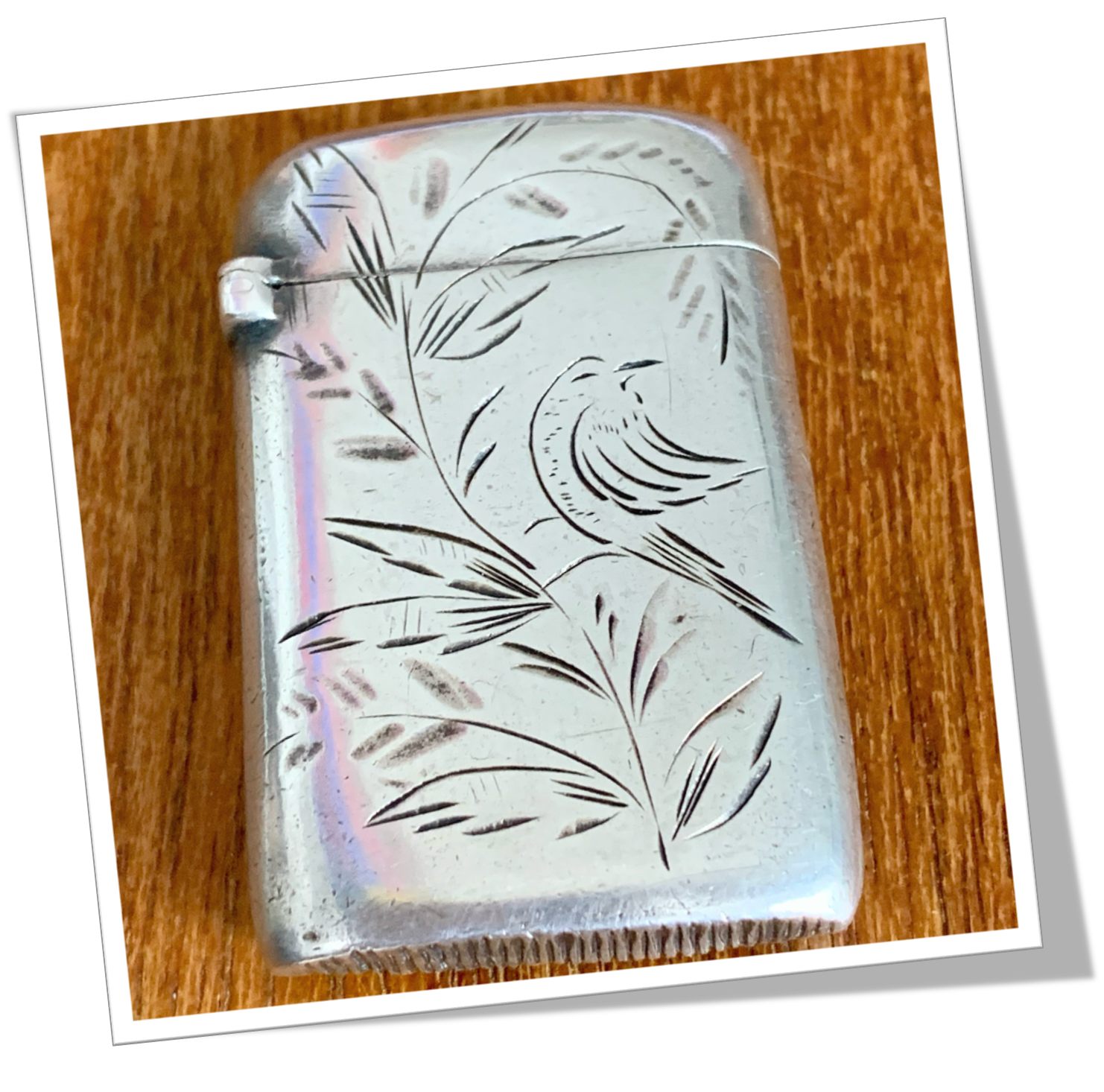 Pyrogène Vesta Case En argent 925 et de forme rectangulaire, rehaussé au recto d’une gravure de style japonisant, représentant un oiseau et feuillage. 19g.Clapet 1/5 4/5 et grattoir plat à la base.