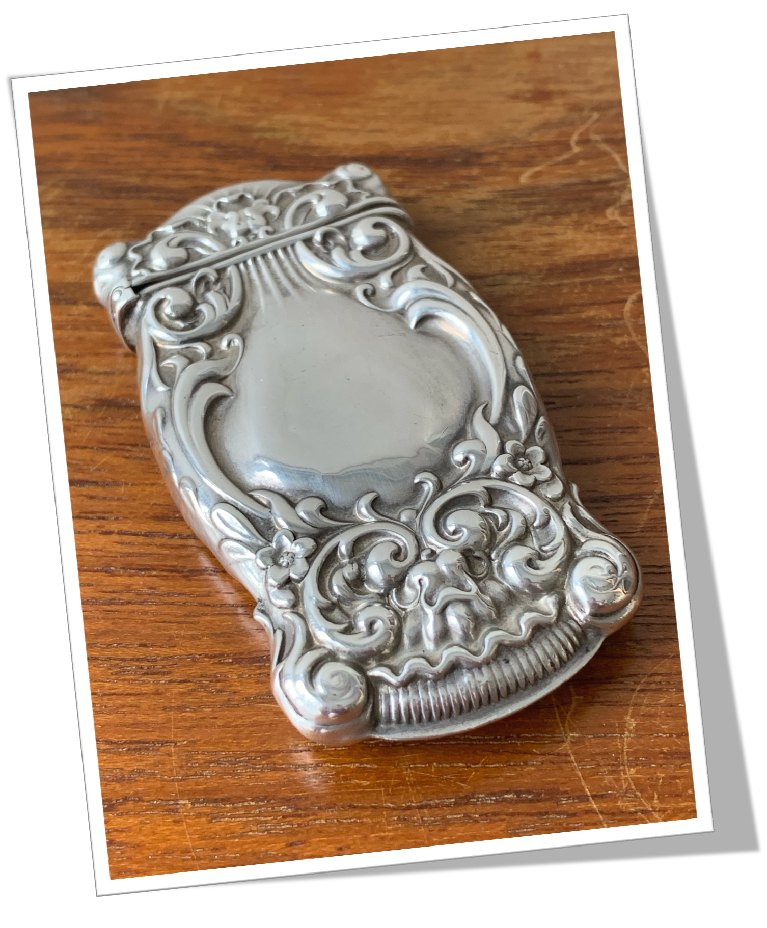 En argent 925 et de forme polygonale. Rehaussée d’ornements et coquillages de style Rocaille, en technique « repoussé ». Monogramme « BCR » au recto. 28g.