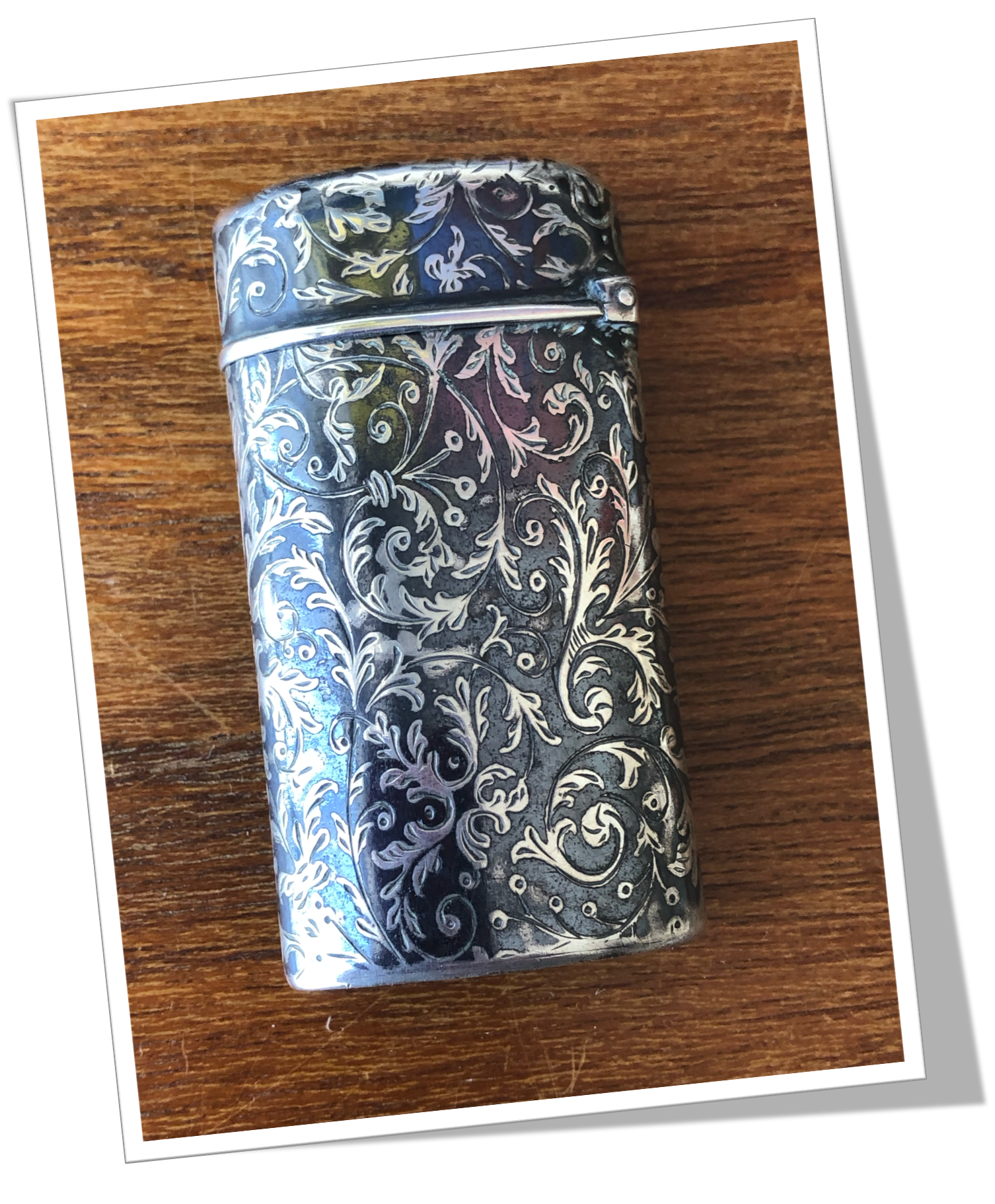 Pyrogène Vesta Case En argent 925 niellé et de forme rectangulaire, rehaussé d’ornements et décor floral ciselés de style Art Nouveau.Clapet 1/5 4/5 et grattoir plat à la base.