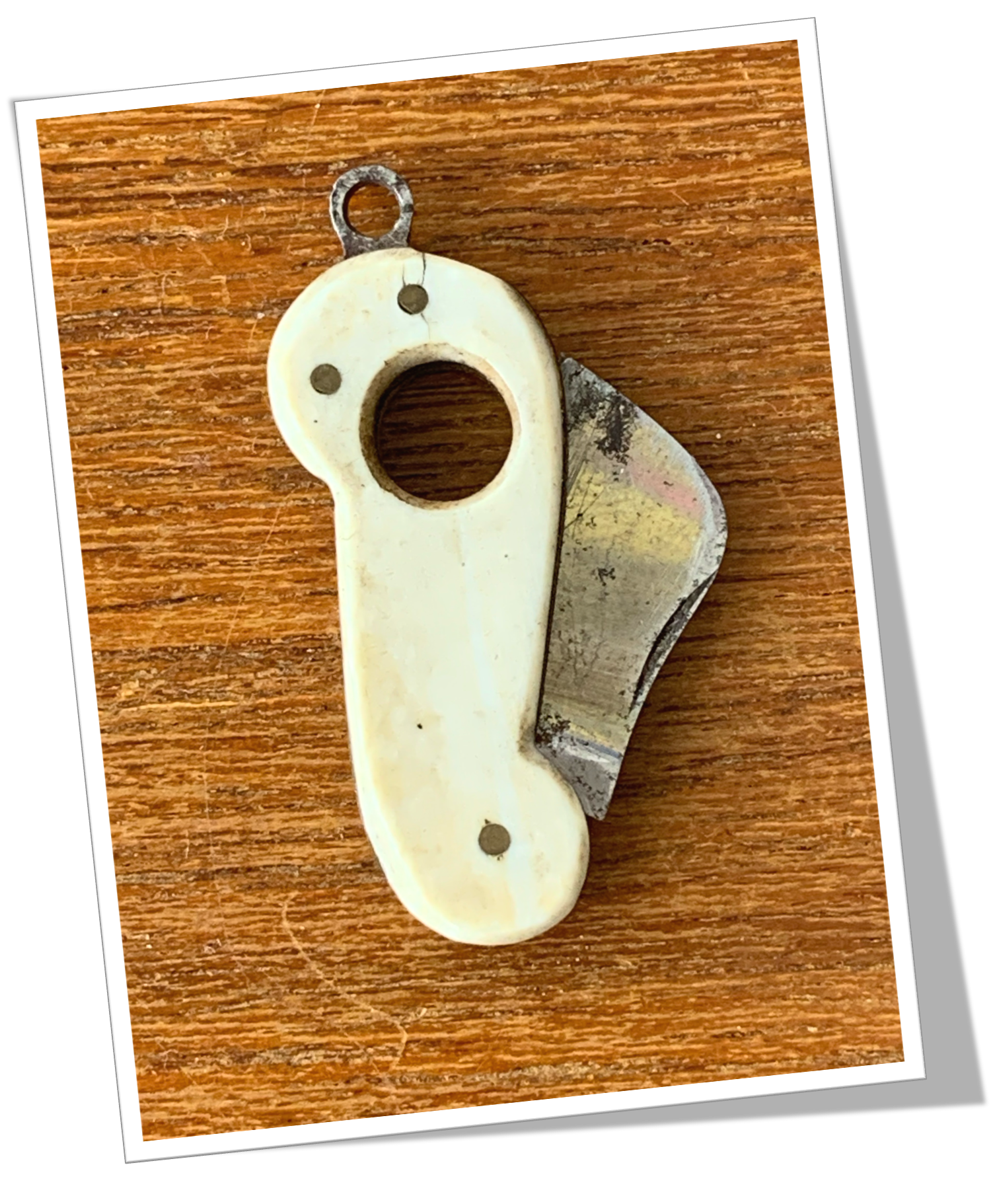 Coupe-Cigare de poche En forme de corne d’abondance à côtes rivetées en os.Lame guillotine à ressort. Bélière manquante.