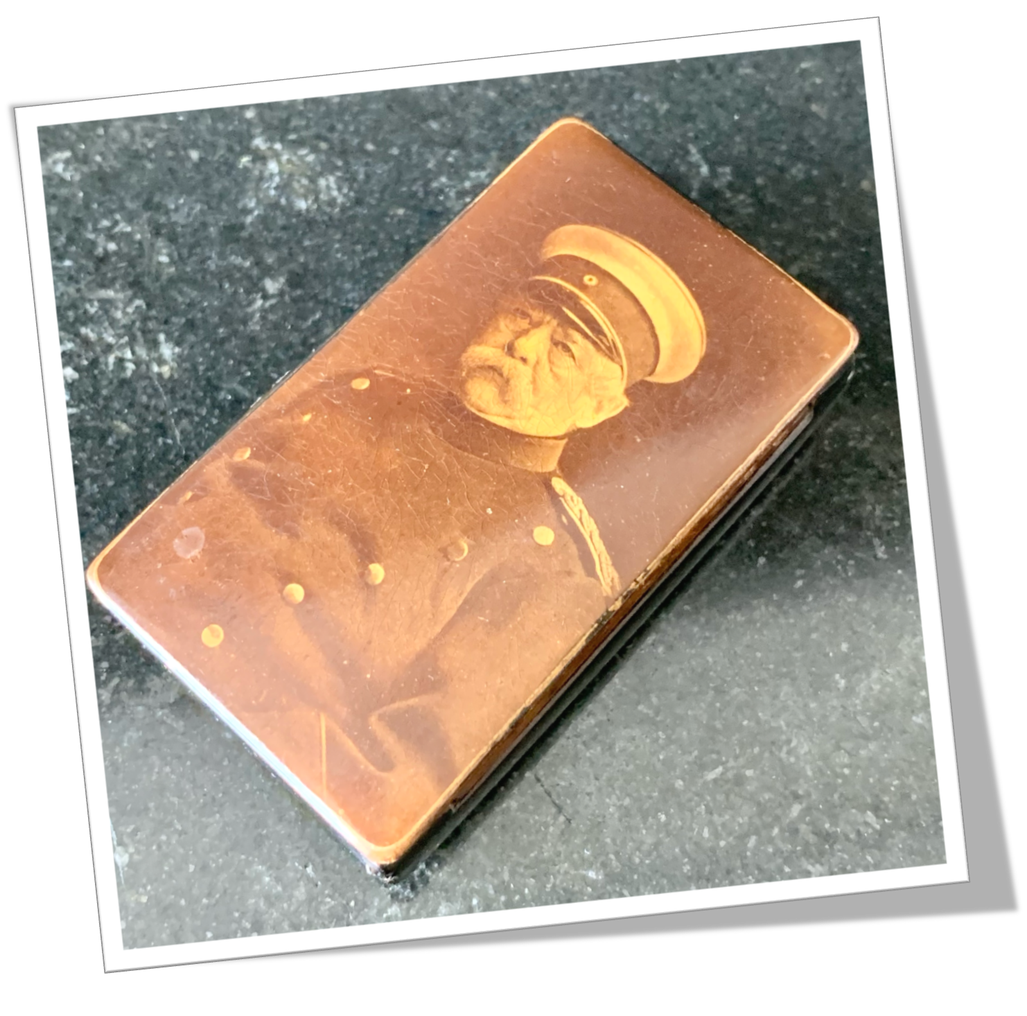 En papier mâché laqué brun noir et, de forme rectangulaire. Rehaussé au recto d’un portrait photographié et peint de Otto Von Bismarck dans le style « STOBWASSER ». 28g.