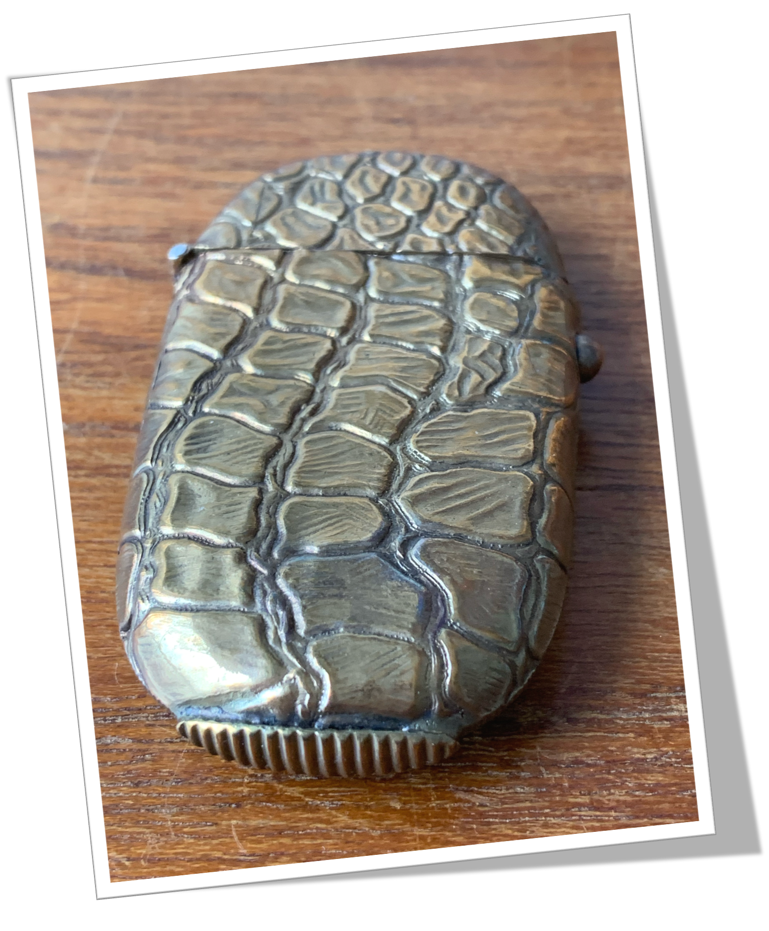 Pyrogène Vesta Case En laiton et de forme ovoïde, ciselé façon peau de crocodile, alligator, reptile. De style Novelty Victorien.Clapet 1/5 4/5 avec bouton poussoir de relâchement. Grattoir plat à la base.