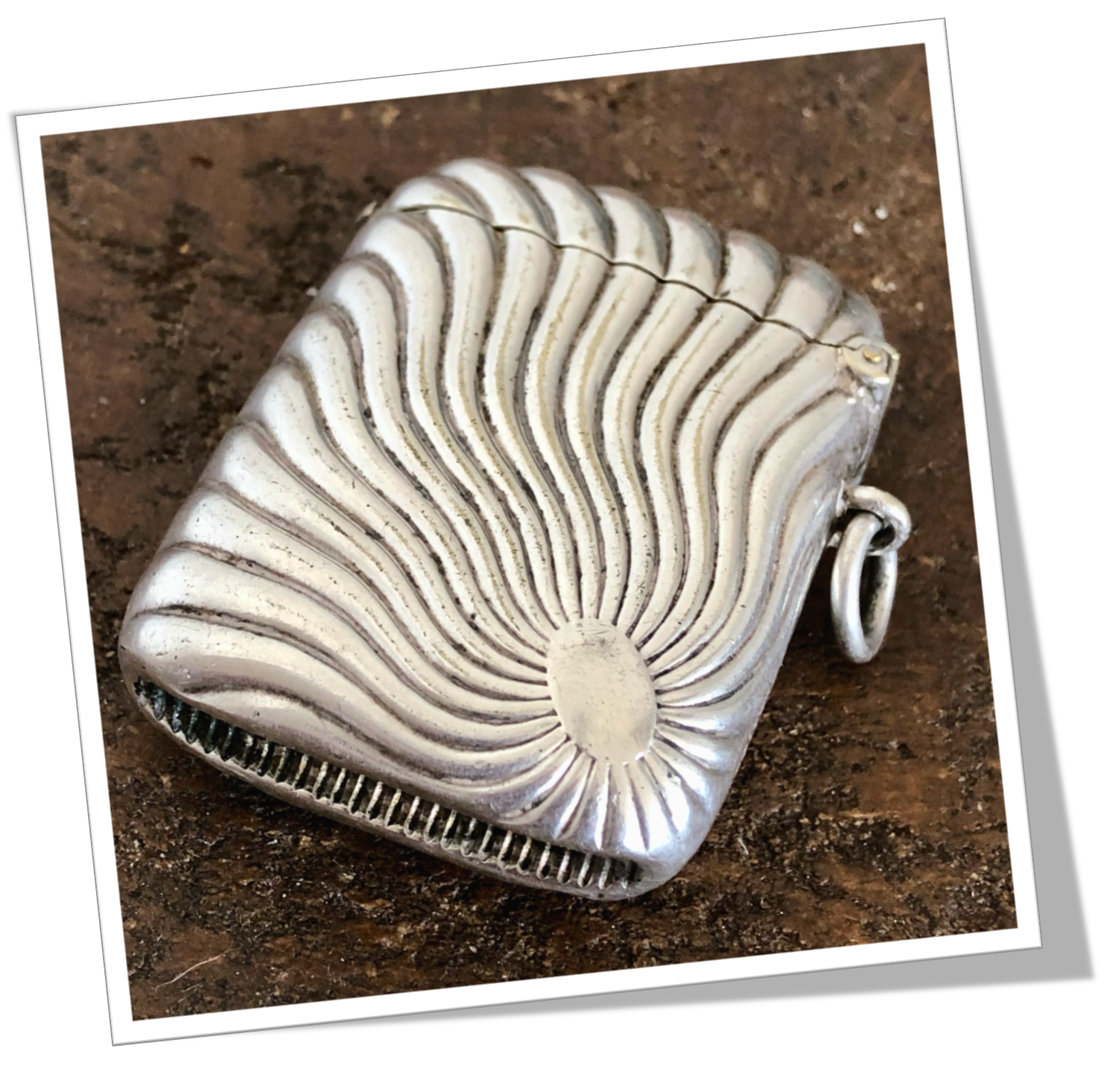 Pyrogène Vesta Case En métal argenté et de forme rectangulaire. Rehaussé d’un relief de style cinétique, représentant des « vagues rayons ondulés » en soleil rayonnant, agrémenté d’un cartouche ovoïde dans l’angle. Intérieur gilt « vermeil ». Style Victorien.Clapet 1/5 4/5 et grattoir concave à la base. Bélière latérale.