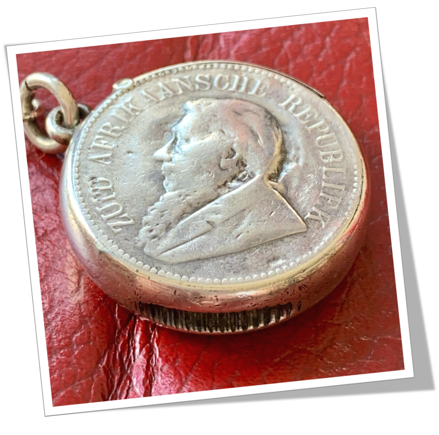 Pyrogène Vesta Case En argent 900. Pièce de Paul Kruger 2 1/2 Shillings 1896 ZAR, Afrique du Sud.Clapet languette et grattoir concave à la base.