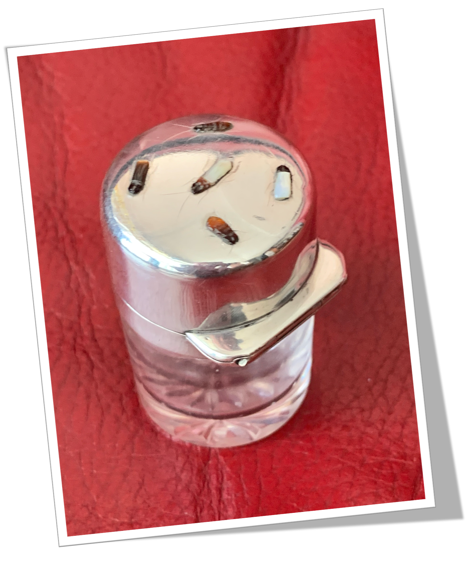 Flacon cylindrique en verre trempé, clapet en argent 925 lisse poli miroir avec insectes de style Shibayama appliqués sur le clapet.