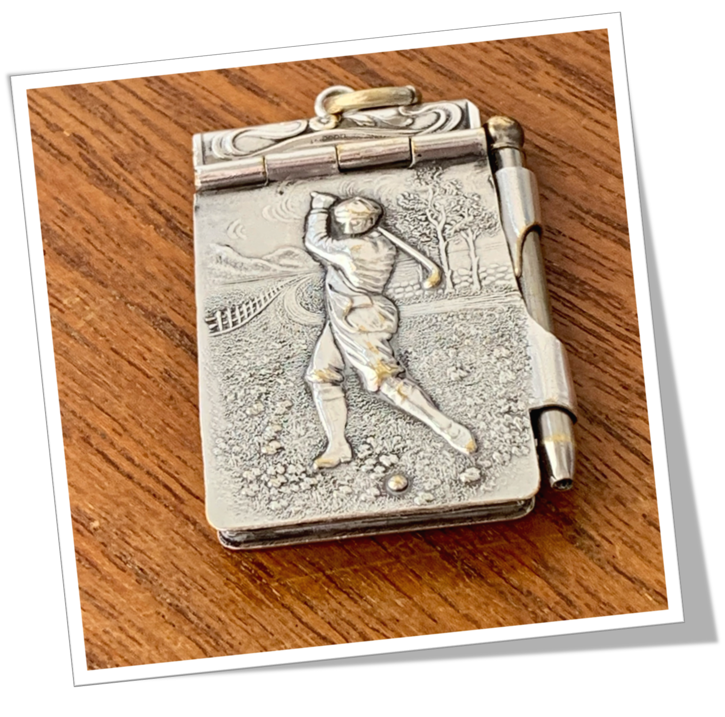 Carnet de scores En métal argenté et de forme rectangulaire. Ornements et golfeur en action sur fond de terrain. Le tout en technique « repoussé ». N*10 du lot de 10pcs. Style Victorien.Clapet rabattable. Porte mines et son fourreau latéral. Bélière.