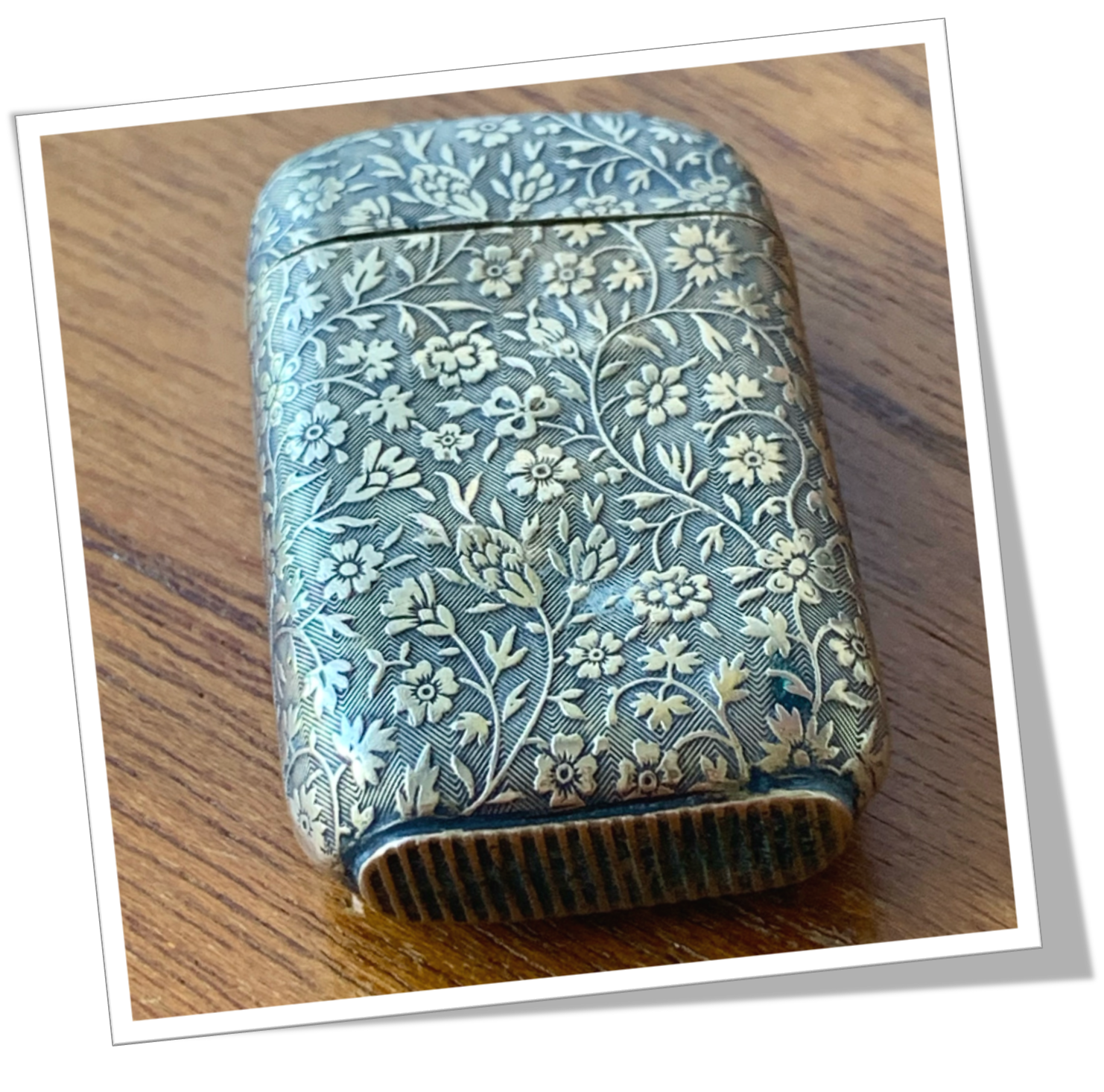 Pyrogène Vesta Case En laiton et de forme rectangulaire, rehaussé d’un guillochis ciselé de tapis de fleurs.Clapet à charnière 1/5 4/5 basculant vers l’arrière. Grattoir plat à la base.
