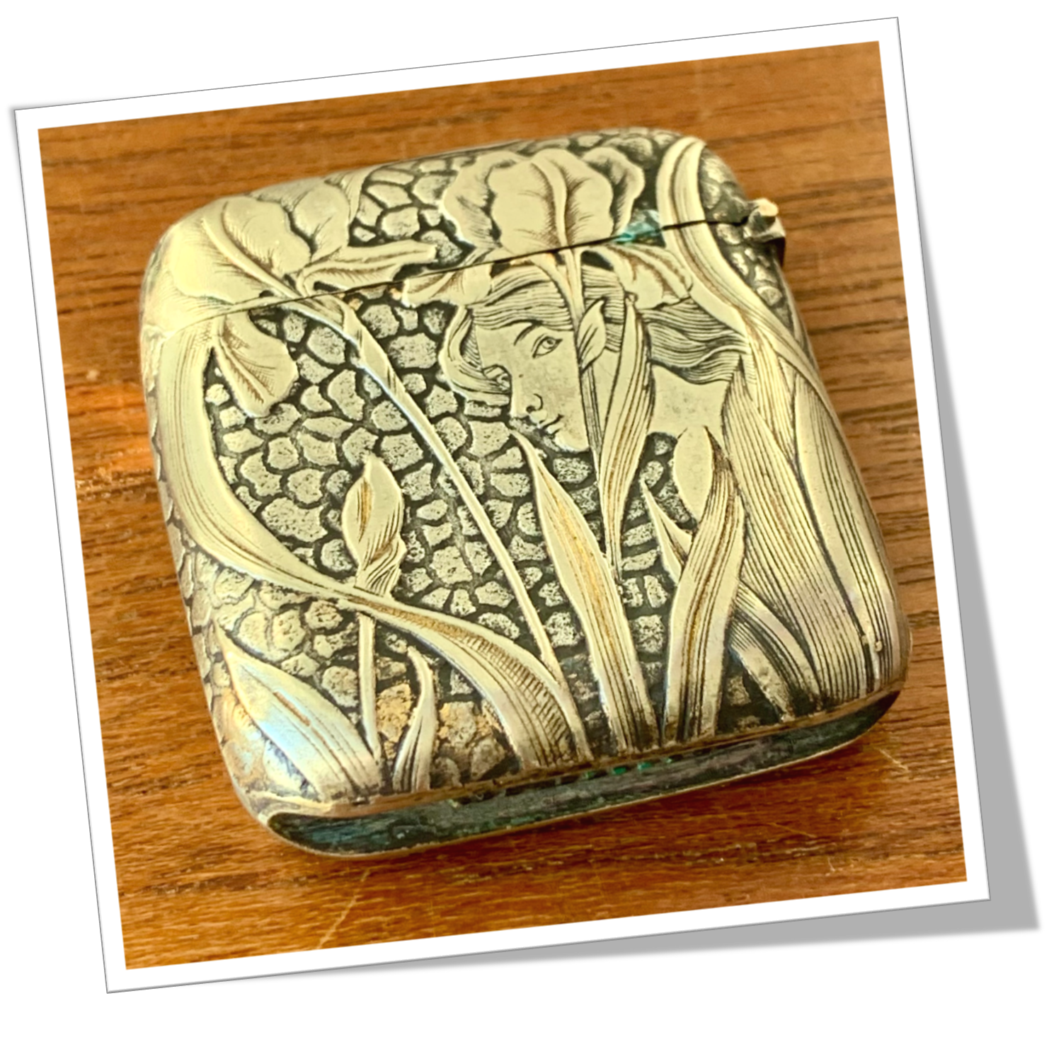 Pyrogène Vesta Case En laiton argenté et de forme carré. Rehaussée d’un fond écailleux, agrémenté d’un portrait de jeune femme entre des fleurs d’anémones ciselées de style Art Nouveau.Clapet 1/5 4/5 et grattoir concave à la base.