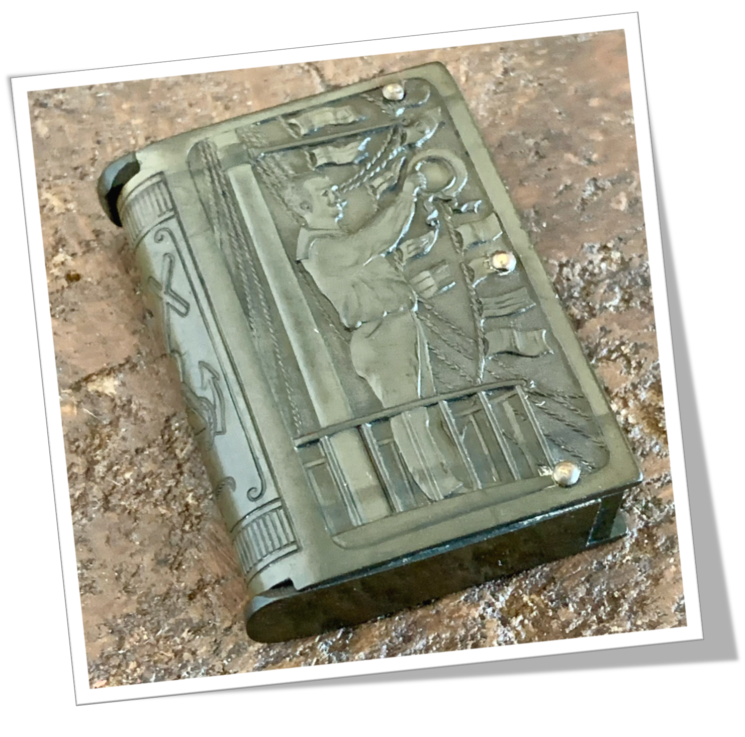 Pyrogène Vesta Case En vulcanite et en forme de livre ancien. Rehaussé d’un relief sur le thème marin, représentant au recto un marin sur le pont, instrument en main et, au verso, un navire de guerre. Tranche agrémenté d’épées croisées.Clapet à zéro et grattoir latéral plat.
