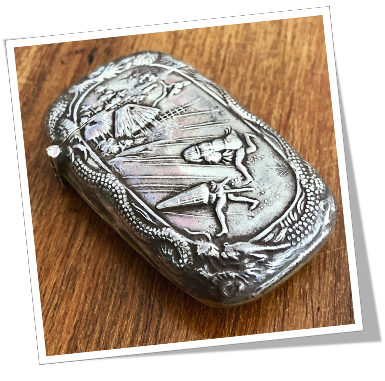 Pyrogène Vesta Case En métal argenté et de forme ovoïde, rehaussé d’un relief en médaillon et en technique « repoussé », de style Japonisant, représentant des paysans dans les champs, s’abritant de la tempête. Un clin d’œil pour l’œuvre du Maître peintre japonais Hiroshige. Serpent sur les bords.Clapet 1/5 4/5 et grattoir plat à la base.