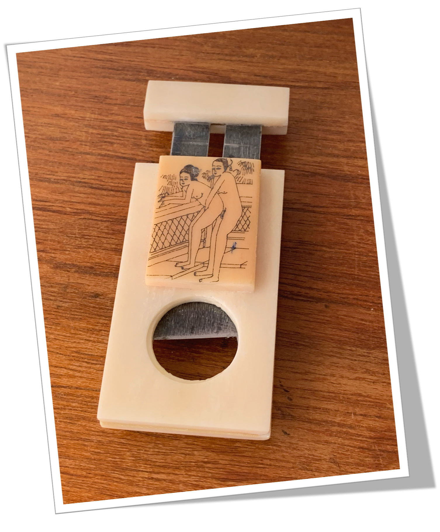 Coupe-Cigare de poche Côtes rectangulaires en os bovin, agrémentées de deux scènes érotiques appliquées de style « Shunga » (images de printemps). Style Japonisant. Collerette habillée.Guillotine à collerette invisible.