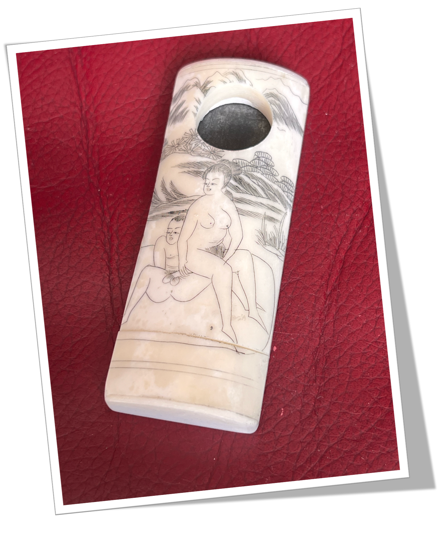 Coupe-Cigare de poche Côtes rectangulaires appliquées en os bovin, agrémentées au recto dune scène érotique gravée de style « Shunga » (images de printemps). Style Japonisant. Collerette habillée.Guillotine à collerette invisible.