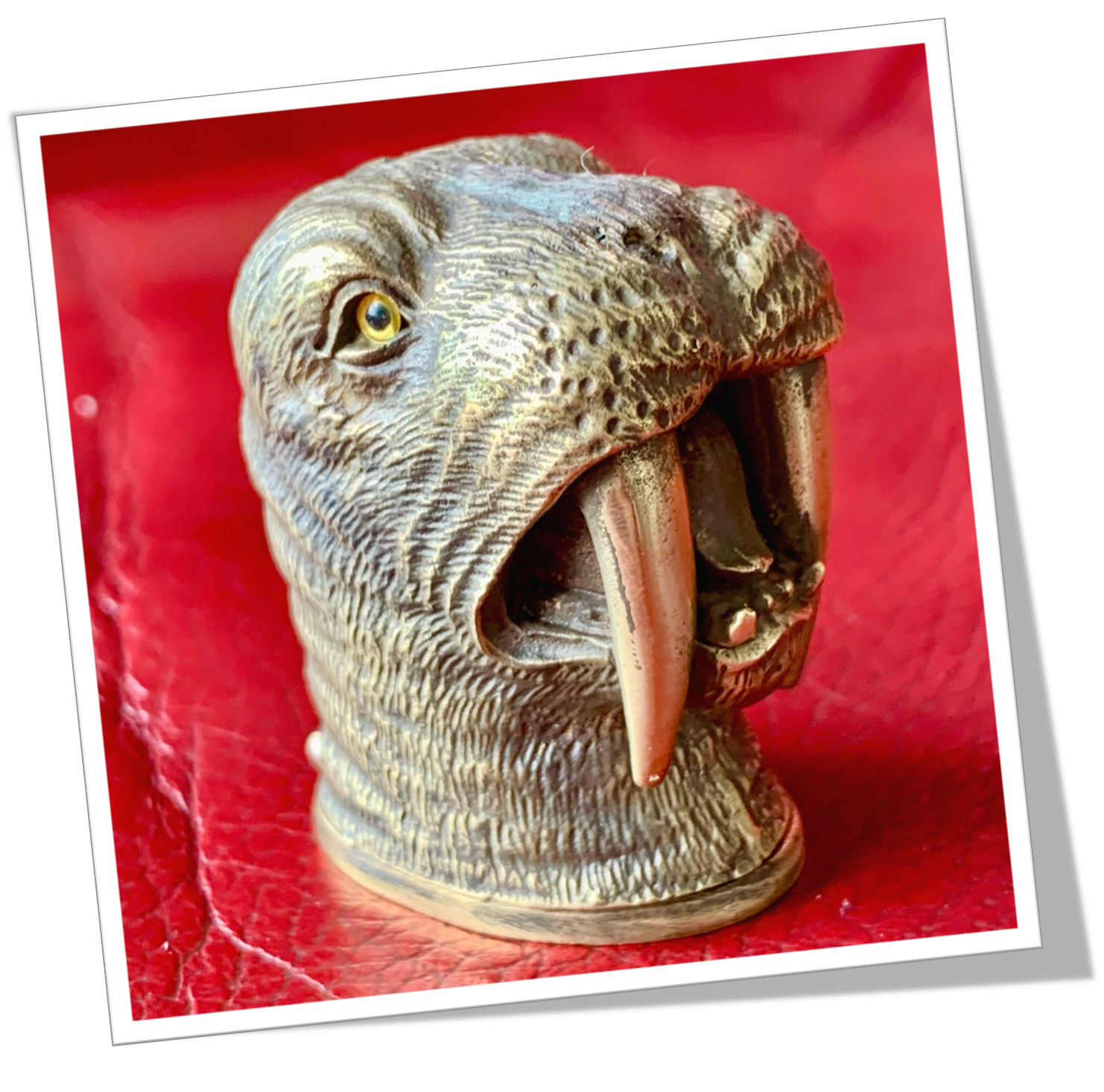 Pyrogène Vesta Case En laiton et de style Novelty animalier. Moulé et texturé en forme d’une tête de morse.Clapet à zéro au bas du cou avec grattoir plat.
