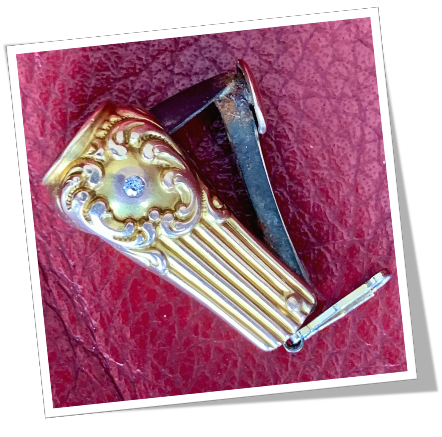 Probablement en or 10ct, rehaussé d’ornements en technique « repoussé » et agrémenté d’un diamant serti sur l’une de ses faces. Bouton habillé d’or.