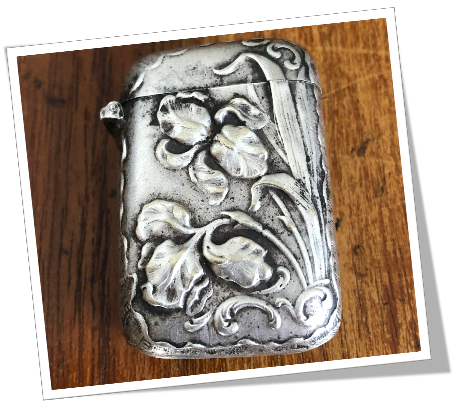 Pyrogène Vesta Case En métal argenté et de forme rectangulaire. Rehaussée d’un décor floral d’anémones de style Art Nouveau en technique « repoussé ». Intérieur gilt « vermeil ».Clapet à charnière 1/5 4/5 et grattoir concave à la base.