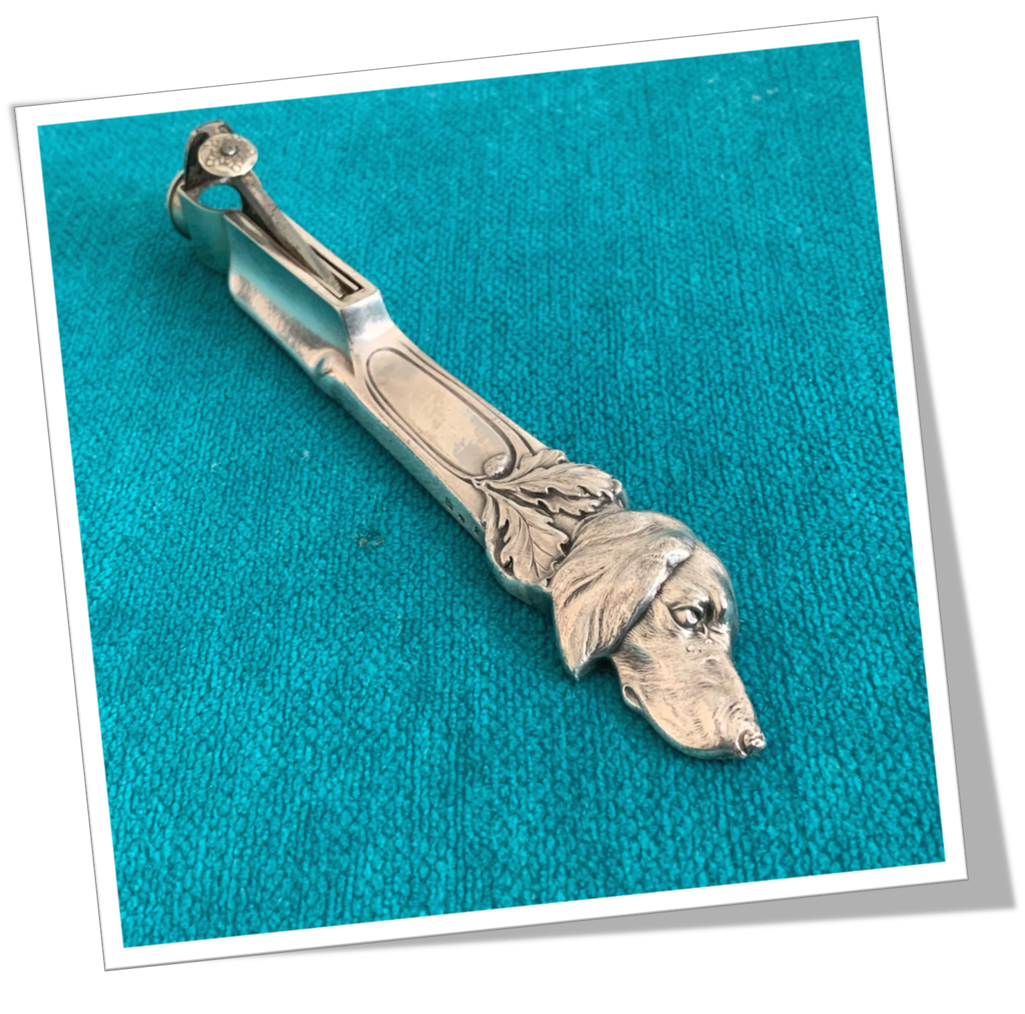 Coupe-Cigare de table Manche zoomorphe en laiton argenté, moulé et texturé avec relief d’un chien de chasse. Agrémenté d’un décor floral autour d’un cartouche vierge. En acier. Manche long agrémenté d’une tête ancienne de type Cat-Eye (V-Cut) rehaussée d’un bouton circulaire. 16cm.