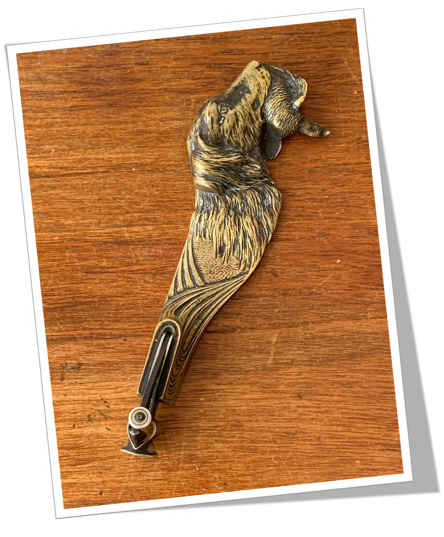 Coupe-Cigare de table En laiton, rehaussé d’un relief zoomorphe moulé et texturé en forme d’un chien de chasse et sa proie en bouche. De style novelty viennois.En acier. Manche long agrémenté d’une tête ancienne de type Cat-Eye (V-Cut), rehaussée d’un bouton circulaire à sillons. 16cm.
