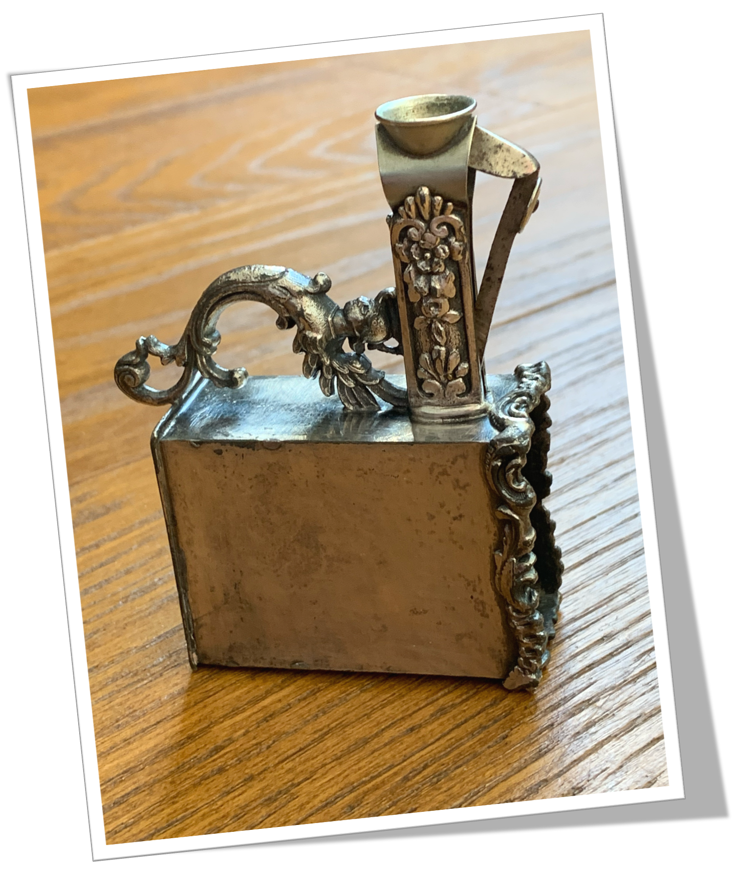 Étui à boîte d’allumettes En métal argenté et de forme rectangulaire, agrémenté de rinceaux et décor floral appliqués.Ouvertures latérales. Coupe-cigare manche, Cat-Eye V-Cut (tête ancienne) intégré.