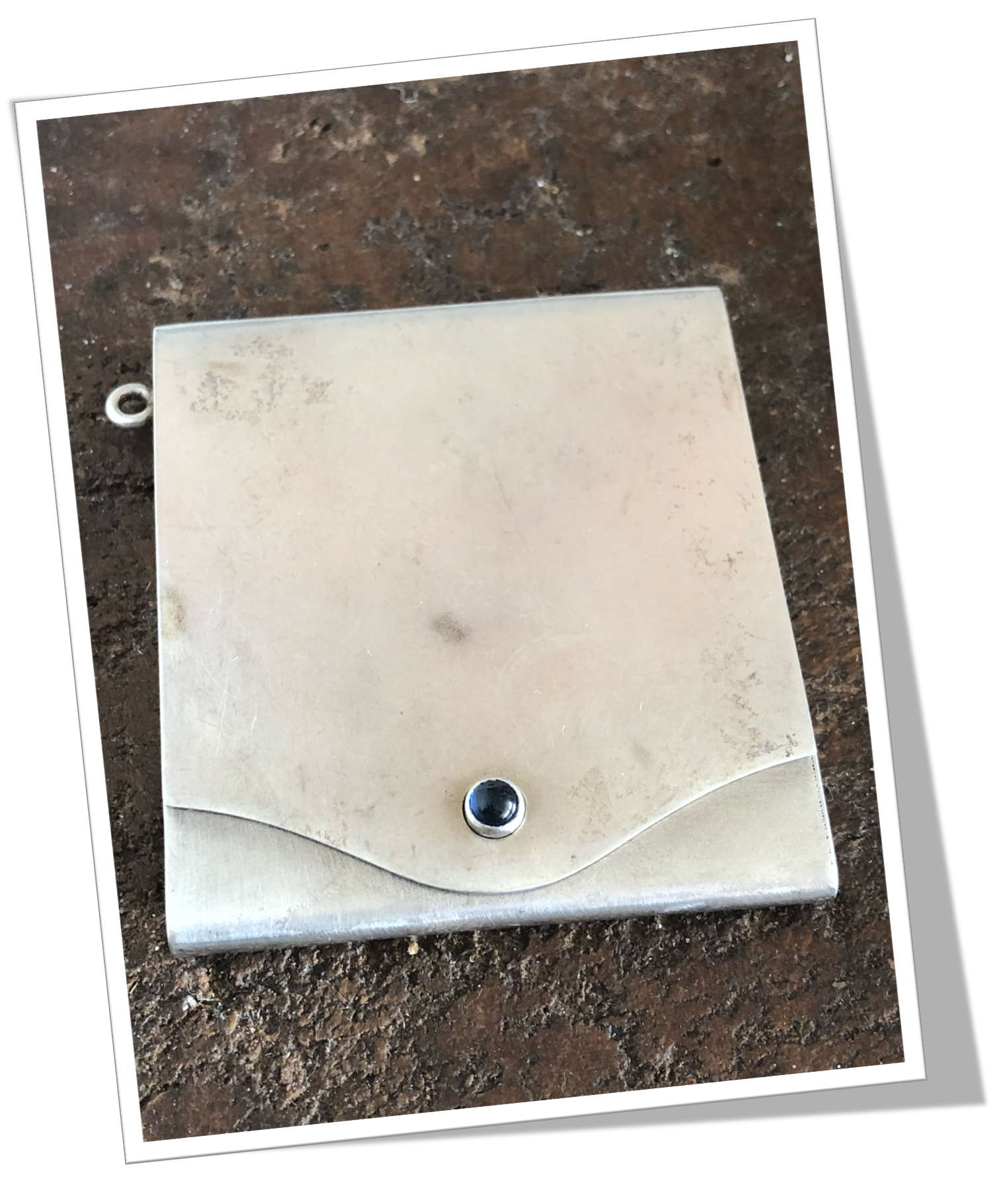 Étui à pochette d’allumettes En argent 800 et en forme d’enveloppe postale, agrémentée d’un cabochon saphir bleu en guise de bouton de fermeture. Rehaussé au verso du monogramme « À mon ami Boris en souvenir de G.R v.k Celle – 1915 ». 34,2g.Capot rabattable. Bélière latérale manquante.