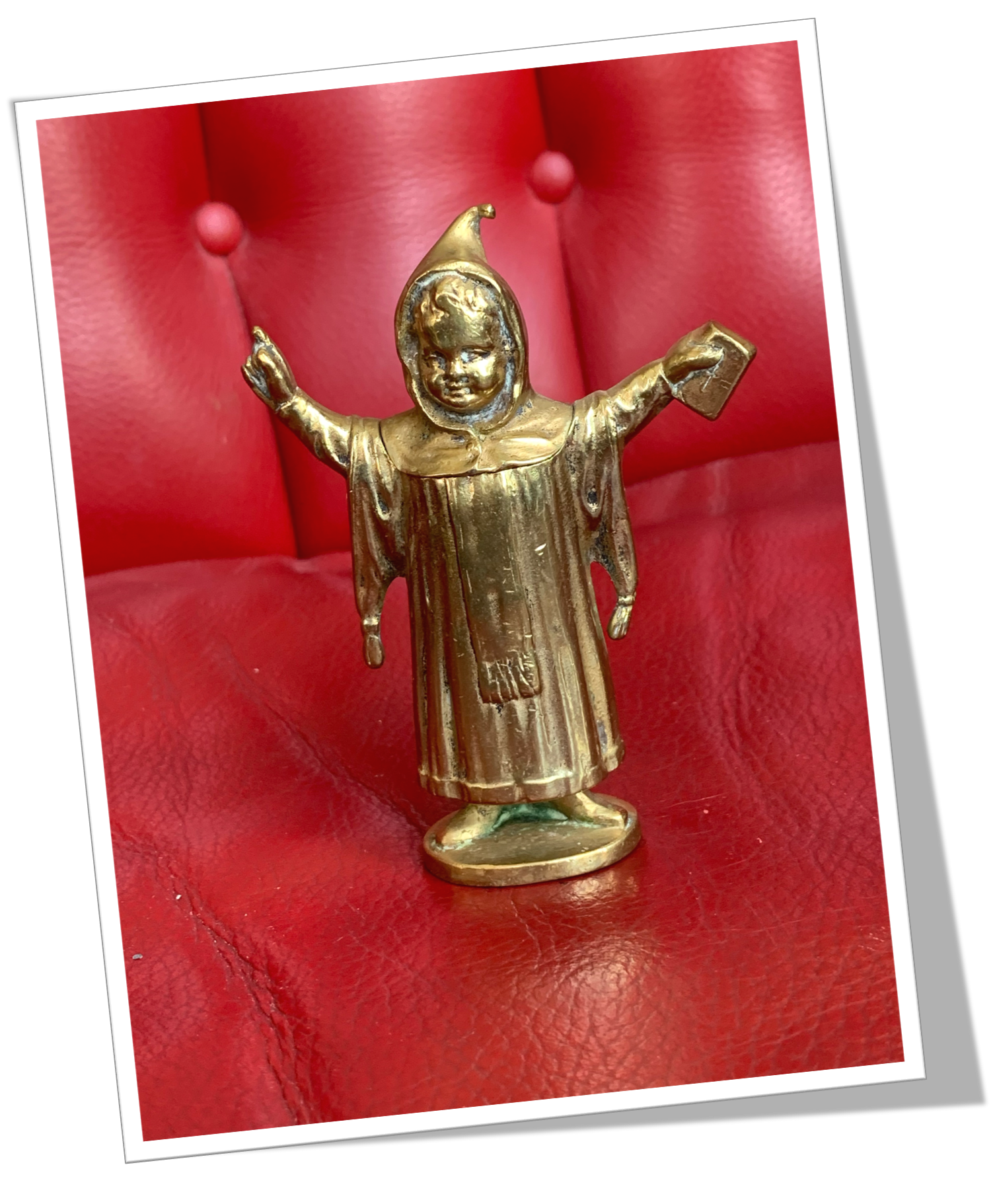 Pyrogène de table En laiton et de style objets religieux. Moulé en forme d’enfant communié en robe et écharpe de cérémonie, la tête couverte par sa capuche et tenant une bible, à bras ouverts.Clapet 1/5 4/5 par basculement de la tête vers l’arrière. Grattoir plat à la base.