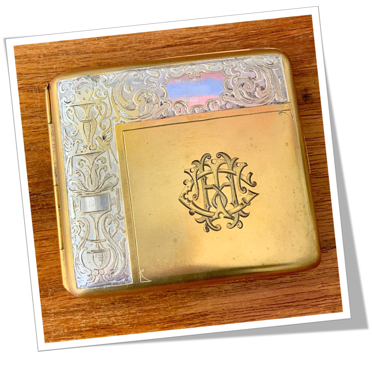 Étui à cigarettes En argent 925 et de forme rectangulaire. Rehaussé sur la partie argenté, de motifs décoratifs et d’ornements de style Art Nouveau. Partie lisse en guise de cartouche au monogramme « HTC », au recto.Capot à charnière 1/2 1/2 avec bouton de relâchement.