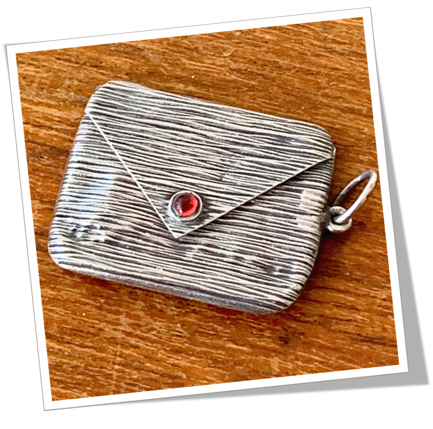 En argent 925. En forme d’enveloppe postale. Tramé façon « tronc d’arbre ». Agrémentée d’un rubis cabochon serti.
