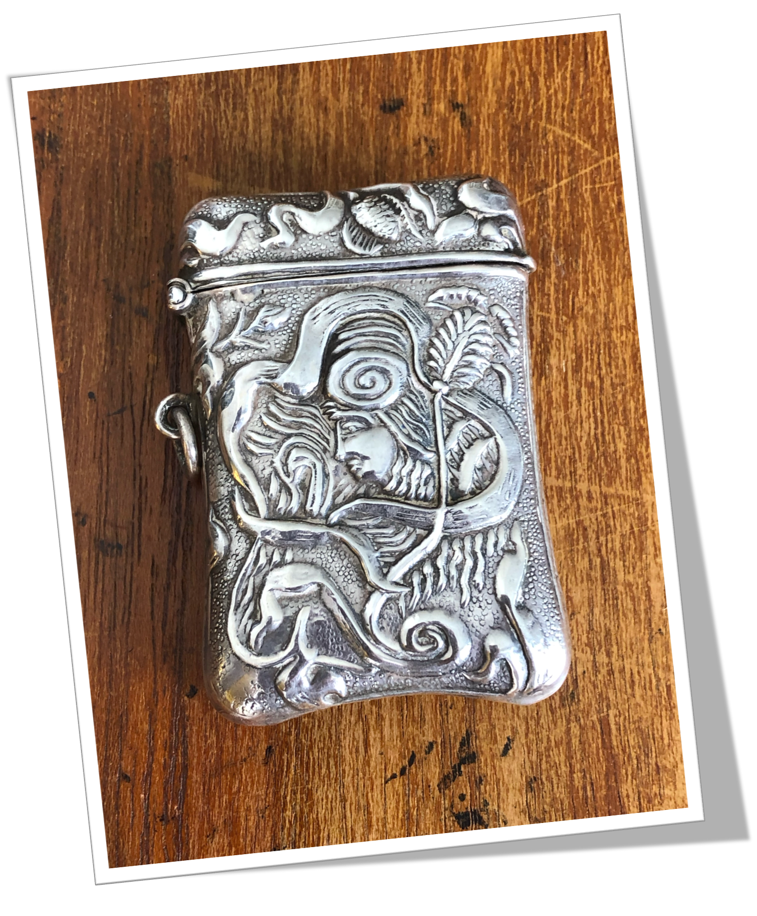 Pyrogène Vesta Case En argent 925 et de forme rectangulaire. Rehaussé d’un relief en technique « repoussé », représentant le buste d’une femme dans un décor imaginaire et surréaliste.Clapet 1/5 4/5 et grattoir concave à la base.