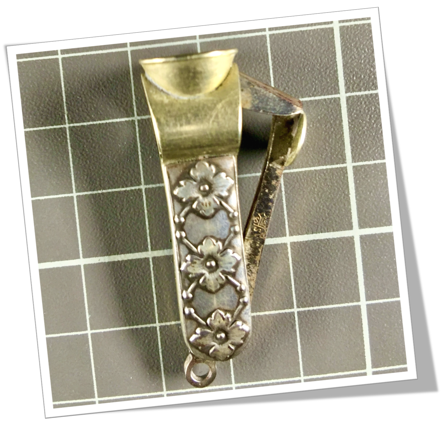 Coupe-Cigare de poche Côtes appliquées en argent 925, rehaussées d’un guillochis « floral » de style Art Nouveau en technique repoussé.En acier. Manche court agrémenté d’une tête ancienne de type Cat-Eye (V-Cut) rehaussée d’un bouton circulaire et d’un anneau levier. 4cm.