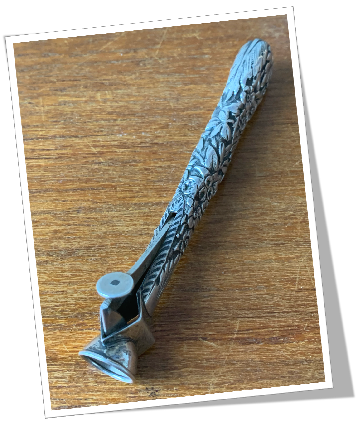 Coupe-Cigare de table En argent 925, moulé et texturé d’un relief de décor floral de style Art Nouveau.En acier. Manche long agrémenté d’une tête ancienne de type Cat-Eye (V-Cut) rehaussée d’un bouton circulaire. 12cm.