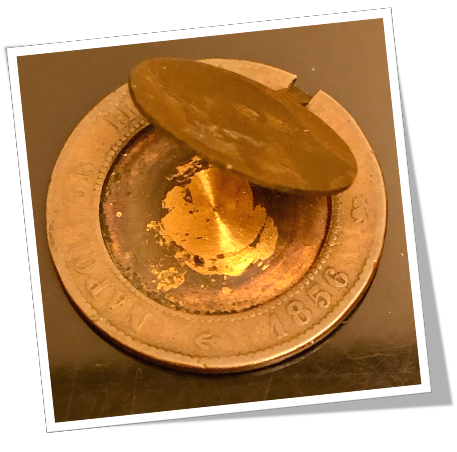 Monnaie de Bagnard Pièce en bronze tranchée et partiellement vidée. Napoléon III 10Cts. 1856, France. Clapet à charnière.